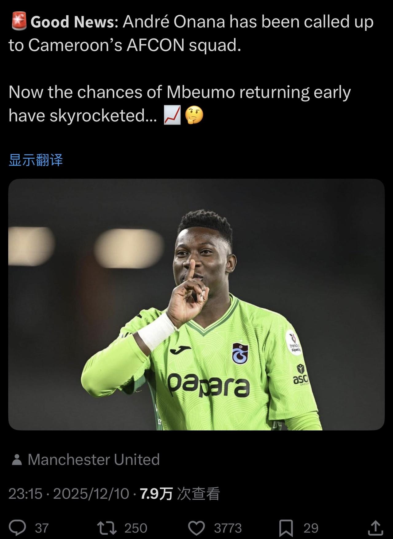 我太喜欢这条消息了: 🔴安德烈·奥纳纳已被征召入喀麦隆非洲杯阵容。 🔴现在姆贝莫提前回归的可能性大大增加 [憨笑][憨笑][憨笑][憨笑][憨笑][憨笑][憨笑][憨笑][憨笑][憨笑][憨笑] 🔴上届非洲杯,奥纳纳可是一场联赛都没缺席(有报道说缺席1场),无论如何请奥纳纳帮助曼联,让姆贝乌莫早点回来[吐彩虹]