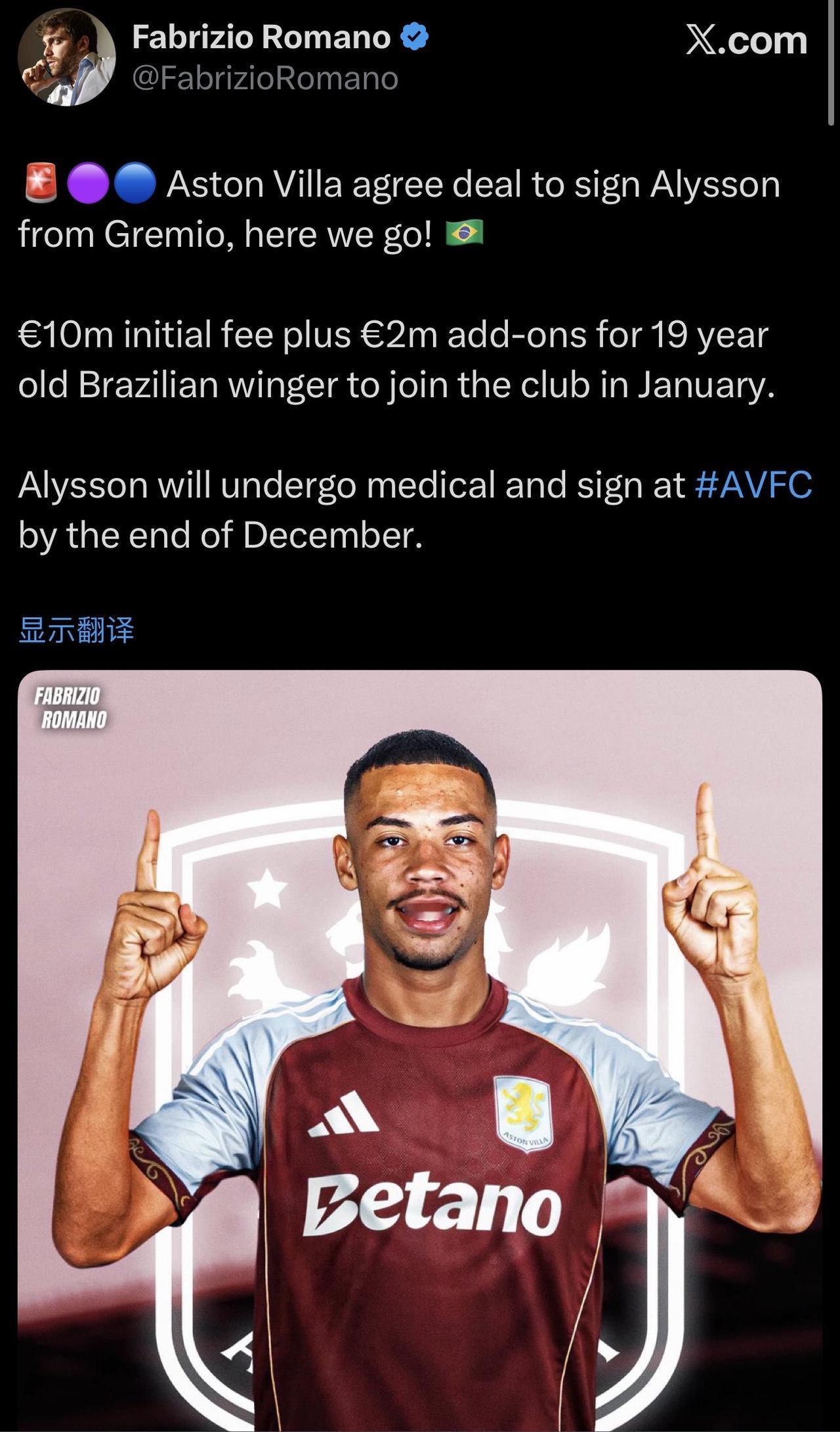1200万欧元的总价,再亏能有桑乔亏?[憨笑] 给我也宁愿这样操作啊。 ……………………………………………………………… 🔴阿斯顿维拉同意从格雷米奥签下阿利松,交易完成! 🇧🇷 🔴1000万欧元的初始转会费加上200万欧元的附加条款,这位19岁的巴西边锋将于1月份加盟俱乐部。