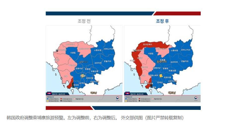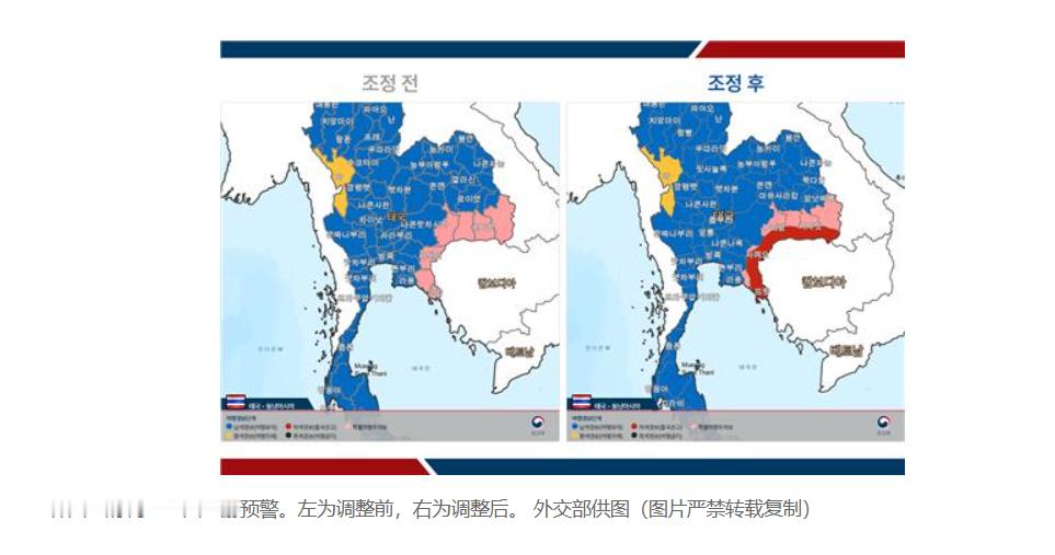 【韩政府上调泰国柬埔寨边境地区旅游预警级别】(韩联社)海外新鲜事热点现场 韩联社首尔12月10日电 韩国外交部10日表示,鉴于泰国与柬埔寨军队在两国边境地区发生武力冲突,韩方已将该地区的旅游预警上调至第三级“建议撤离”。此次调整涉及今年7月发布特别旅游预警(2.5级)的部分地区,其中距离边境50公里范围内的地区被提升至第三级。外交部提醒称,计划前往相关地区的韩国公民应取消或推迟行程,停留在当地的公民应尽快转移至安全区域。韩国根据旅游目的地的风险程度由低到高发布蓝黄红黑四级预警,分别对应“注意安全”“谨慎前往”“建议撤离”“禁止旅游”。特别旅游预警主要为应对短期风险而发布,介于黄色和红色预警之间,为期90天。(完)