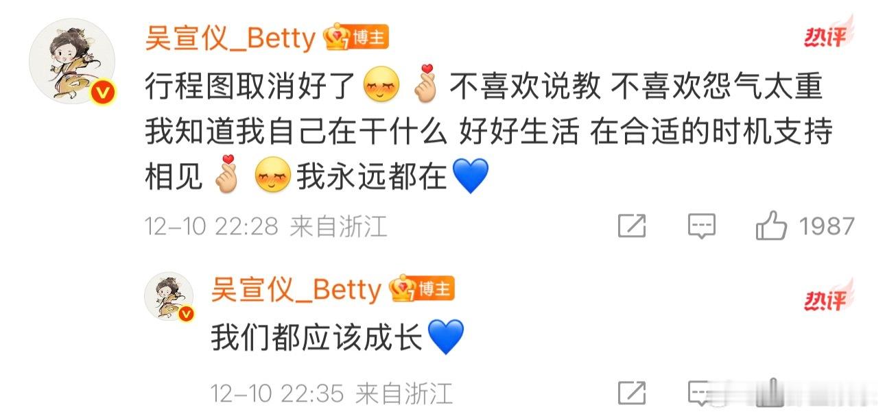 吴宣仪取消行程图10日,发文:“我们是不是应该……保持一些距离”,并在评论区表示将取消行程图,“不喜欢说教,不喜欢怨气太重,我知道我自己在干什么,好好生活,在合适的时机支持相见我永远都在💙。我们都应该成长。”