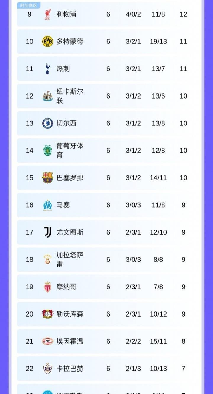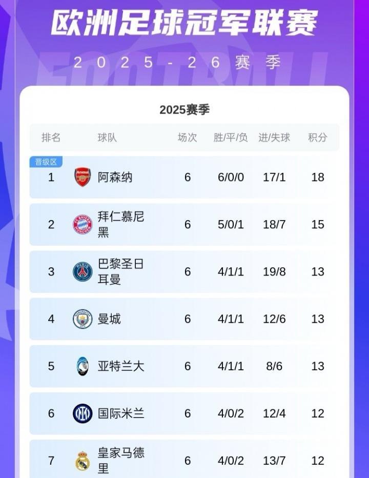欧冠第六轮综述 随着皇马主场1-2被曼城逆转、本菲卡主场2-0那不勒斯,欧冠第六轮的比赛全部结束,来看下具体赛果和排名情况! 阿森纳客场3-0轻取布鲁日收获六连胜领跑积分榜,枪手也是欧冠唯一不败的球队,拜仁3-1葡萄牙体育以15分位居次席,大巴黎客场战平毕尔巴鄂竞技后与曼城、亚特兰大同分排名三四五,国米、皇马、马竞、利物浦四队同为12分排在六到九名! 大黄蜂主场被闪耀哥顽强扳平,热刺3-0轻取布拉格斯拉维亚,两队积11分排名第十和第11,纽卡、切尔西、葡萄牙体育、巴萨四队10分排在12到15名,尤文图斯第17、勒沃库森第20、本轮输球的那不勒斯第23! 主场赢球的本菲卡收获欧冠两连胜升至第25,距离附加赛区域只有一分分差,博德闪耀、布拉格斯拉维亚、比利亚雷亚尔、阿拉木图凯拉特四支球队至今没有赢球,此前五连败的阿贾克斯则收获了欧冠首胜!