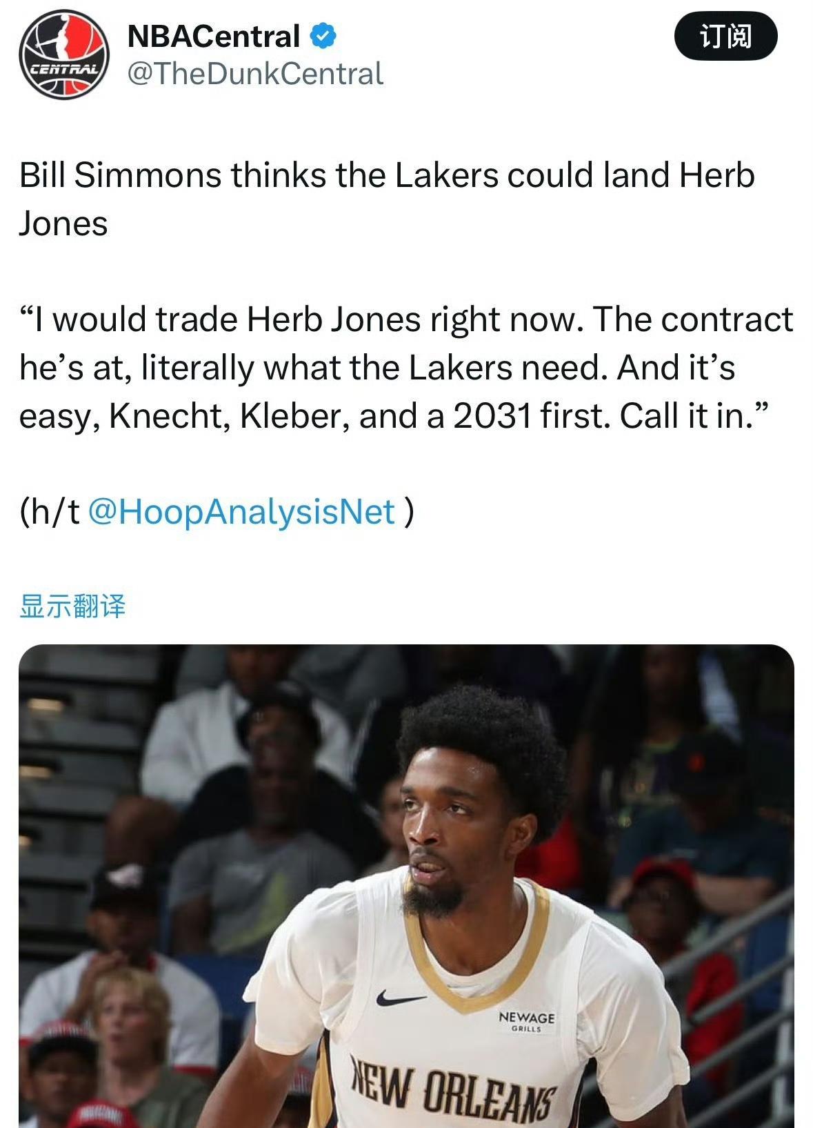 这笔交易性价比拉满,能直接补强湖人最薄弱的外线防守环节。比尔·西蒙斯直言湖人可全力追逐赫伯·琼斯,直言:“我现在就想促成赫伯·琼斯的交易,他的合同完美适配湖人需求,交易方案也清晰可行——用克内、克莱伯搭配2031年首轮签即可敲定,湖人该果断出手了。” #一起来聊聊湖人#