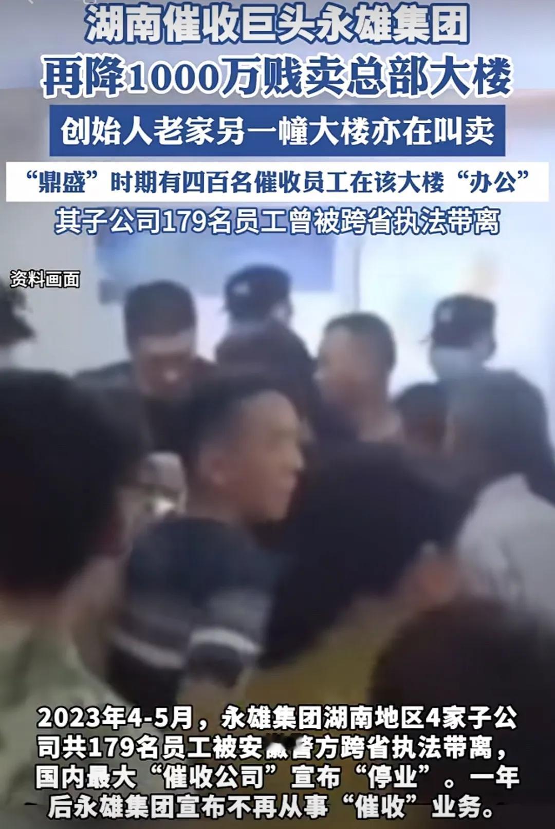 6000万甩卖总部大楼,催收巨头也有今天!曾经令不少人闻风丧胆的湖南永雄集团,近日被曝出低价变卖位于长沙芯城科技园的总部,这栋11层的永雄集团大楼见证了国内第一催收巨头的辉煌历史。为了偿还长沙银行的到期债务,永雄不得已将原来标价7000万的大楼,打折1000万出售,只为尽快回笼资金。 很多年轻人都遭遇过被永雄暴力催收的恐惧,在老板谭曼的爆操盘下,鼎盛时期的“催收帝国”干到了400多号人,整栋大楼同时催收的壮举,也为永雄赢得了全国第一催收的不光彩名头。长期游走在灰色边缘的催收巨头,终于在2023年土崩瓦解,上百名员工被多地警方连锅端抓走后,催收帝国一夜崩塌。这起轰动全国的案件至今还未调查清楚,无数人也在静待宣判结果。 如今永雄变卖最后家产还债,给银行、债主及员工一个交代,谭老板也算是在给自己留条后路。
