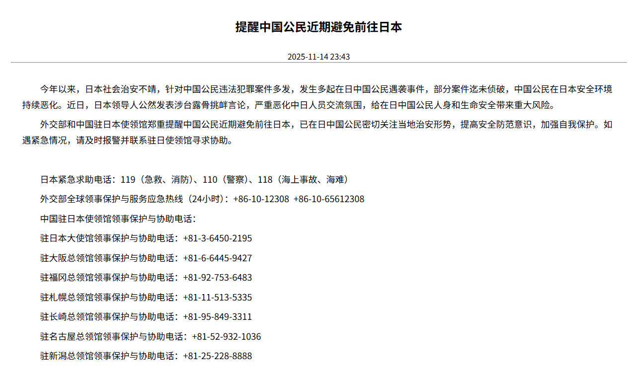 【再次提醒:中国公民近期避免前往日本】#使馆再提醒国公民近期避免前往日本# 12月8日以来,日本本州东部附近海域连续发生多起地震,最大震级达7.5级。目前,地震造成多人受伤,日本多地已观测到海啸,超10万人接到避难指示。日本有关部门公告称,后续或有更大地震。外交部和中国驻日本使领馆提醒中国公民近期避免前往日本,在日同胞密切关注地震及次生灾害预警信息,遵循当地避难指令,加强自身安全防范,远离海边等高风险地区。如遇紧急情况,请及时报警并联系驻日使领馆寻求协助。