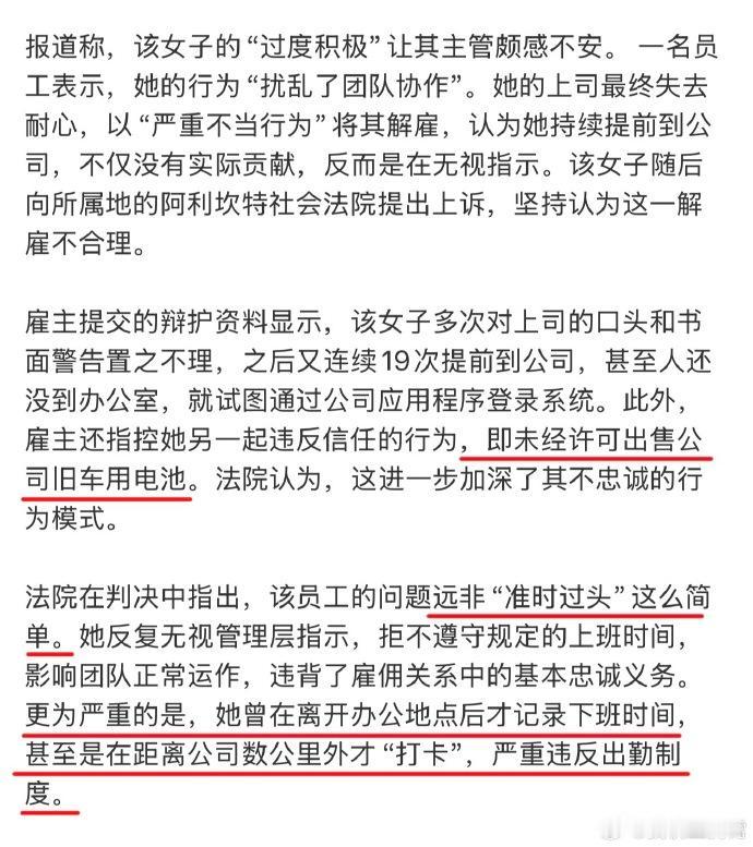 这家媒体是懂流量的,国内加班文化盛行,就起了一条这个 西班牙女员工连续提前到岗被开除 的话题热搜,就这件事而言,被开除的主要原因不是早到,而是 “未经许可出售公司旧车用电池” “离开办公地点后才记录下班时间,甚至是在距离公司数公里外才打卡” ……单位怀疑她早到是为了违规操作。 西班牙阿利坎特社会法院援引《西班牙工人法典》第54条,认定该员工的行为已超出单纯“勤奋”范畴,其持续违规影响团队协作节奏、挑战管理权威,叠加其他违纪事实构成“严重不当行为”,支持公司无赔偿解雇的合法性。 话题成了单独炒作“早到被开除”,这一波流量媒体也是赚了。。。