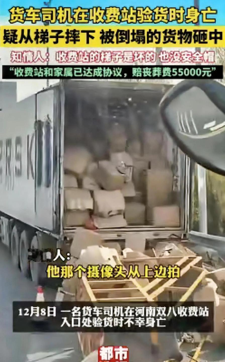 “严查到底!”近日,河南商丘,一货车司机过收费站时,工作人员要检查车上的货物,要求司机爬梯子上去拍照验货,结果 收费站的梯子是坏的,再加上司机没有佩戴安全帽,没人扶梯,最终摔落离世。网友:不应该工作人员上去拍照吗? 网友的疑问戳中了所有人的痛点——查验货物是收费站的职责,凭什么要让司机冒着生命危险去完成?这位来自山东聊城的李师傅,拉着满满一车生姜走绿通,从广西百色赶往山东潍坊,一路风餐露宿,没成想在商丘双八收费站,把命留在了这架2米多高的破梯子上。 2米多高啊!这可不是小土坡,按国家标准GB/T3608-2022《高处作业分级》,这已经属于高空作业范畴。收费站工作人员自己戴着安全帽,却没给李师傅提供任何防护,甚至连梯子的固定扣都是坏的,轮子一滑就可能失衡。 李师傅当时就跟工作人员沟通过,说货物没装满容易倾斜,可对方根本没当回事,依旧坚持让他爬上去搬货拍照。谁能想到,这一爬就成了永别,搬第四箱生姜时,梯子突然移位,他连人带货摔下来,被沉重的货箱砸中,再也没醒过来。 一条鲜活的生命,换来了55000元丧葬费的初步协议。可这笔钱,能弥补他家人失去顶梁柱的痛苦吗?跑长途货车的师傅们,哪个不是家里的主心骨?风里来雨里去,赚的都是血汗钱,不是用来给收费站的失职买单的。 更让人寒心的是,这种“让司机冒险验货”的操作,并非个例。不少货车司机吐槽,有些收费站查验绿通时,不管货厢多高,都要求司机自己爬上去揭篷布、搬货物,工作人员只在底下指挥拍照。 福建就发生过类似的糟心事,一位师傅拉3000箱苹果走绿通,被收费站要求全部卸货检查,不卸就交4000多过路费。师傅拿出其他收费站的合格证明也没用,最后只能含泪交钱,就为了不耽误交货时间,怕苹果磕碰损坏。 这些收费站嘴上说着“按规定办事”,却选择性忽略了最基本的安全规定。公益律师早就明确说了,收费站作为查验组织方,有义务提供安全设备和防护装备,登高查验必须有人扶梯子,至少两人协作,哪能让司机孤身冒险? 国家2022年就发布过通知,要求用数字辐射透视成像这些科技手段搞绿通查验,实现精准识别,减少人工操作。可商丘这个收费站倒好,技术设备不用,偏偏用一架坏梯子,把司机的安全当儿戏。 看看湖北的收费站怎么做的:配备激光测距仪等专业工具,工作人员自己动手核查,还提前跟司机对接信息,减少现场等待时间。同样是执行规定,有的地方把服务做到位,有的地方却把风险转嫁给司机。 李师傅的悲剧,绝不是“意外”那么简单。梯子坏了没人修,高空作业不防护,工作人员漠视司机的安全提醒,这每一个环节的失职,都在把他推向深渊。如果梯子是完好的,如果有人扶一把,如果给了安全帽,这场悲剧根本不会发生。 更讽刺的是,事发地商丘梁园区,前不久还在开展“清锁清桩清墩”专项行动,说要“除险保安”,保障群众出行安全。可收费站里这架致命的坏梯子,怎么就没被排查出来?安全整治不能只做表面功夫,更要盯着这些容易出事的“角落”。 货车司机是物流运输的毛细血管,撑起了千家万户的物资供应。他们不该在辛苦奔波之余,还要面对这样的无妄之灾。收费站的职责是保障道路畅通、规范查验,而不是给司机设置生命陷阱。 55000元的丧葬费远远不够,后续的司法程序必须给家属一个交代。那些失职的工作人员、疏于管理的负责人,都该被严肃追责。更重要的是,全国所有收费站都该以此为戒,彻底整改绿通查验流程。 该配的安全设备必须配,该上的科技手段必须上,该工作人员干的活,不能再推给司机。别等悲剧重演,才想起弥补;别等舆论监督,才开始整改。 生命没有第二次,安全不能当儿戏。希望李师傅的离去,能真正敲响警钟,让所有收费站都明白:规定是为了规范管理,而不是制造风险;服务群众,才是执法的初心。 各位读者你们怎么看?欢迎在评论区讨论。收费站超载 司机过收费站