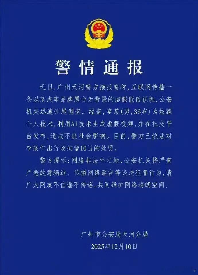 网警查处一起AI生成虚假低俗视频案上次小鹏车展那事有调查结果了。是李某利用AI技术生成的虚假视频,造成社会不良影响,行政拘留10天