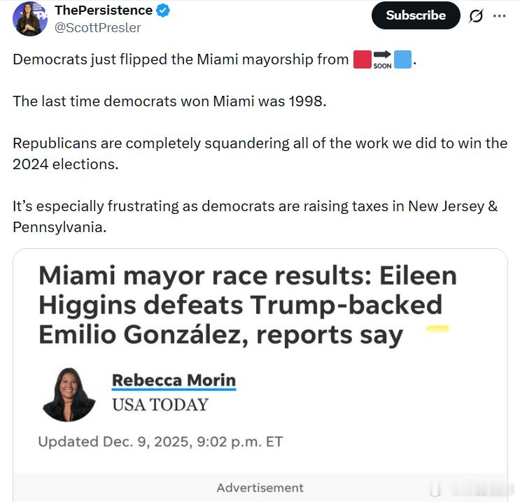 斯科特·普雷斯勒:民左党刚刚把迈阿密市长职位从红色翻转为蓝色。上一次民左党赢得迈阿密市长选举还是1998年。共和党完全在浪费我们在2024年选举中辛苦取得的成果。尤其让人沮丧的是,民左党现在还在新泽西州和宾夕法尼亚州提高税收。