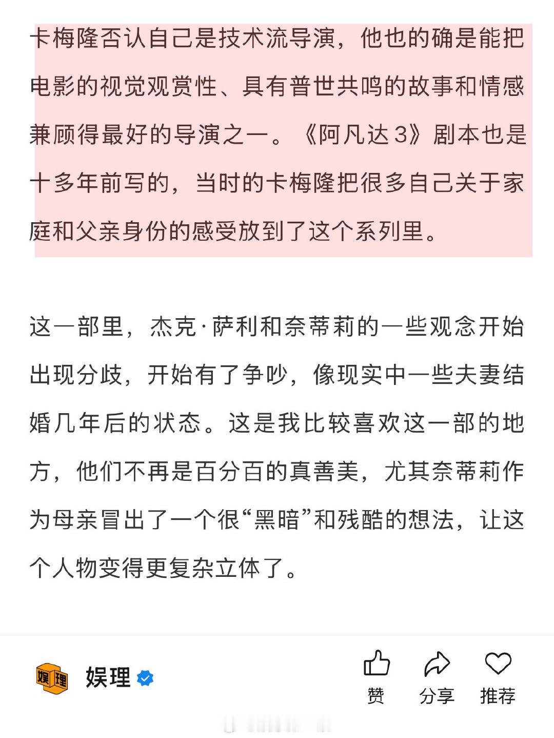 阿凡达3还能爆吗 阿凡达3很重视中国票房 卡梅隆否认自己是技术流导演,他也的确是能把电影的视觉观赏性、具有普世共鸣的故事和情感兼顾得最好的导演之一。《阿凡达3》剧本也是十多年前写的,当时的卡梅隆把很多自己关于家庭和父亲身份的感受放到了这个系列里。主题上,《阿凡达3》依旧呈现了人类贪婪逐利的黑暗面,用最直白的故事和画面呼吁保护环境,敬畏自然…娱理独家↓