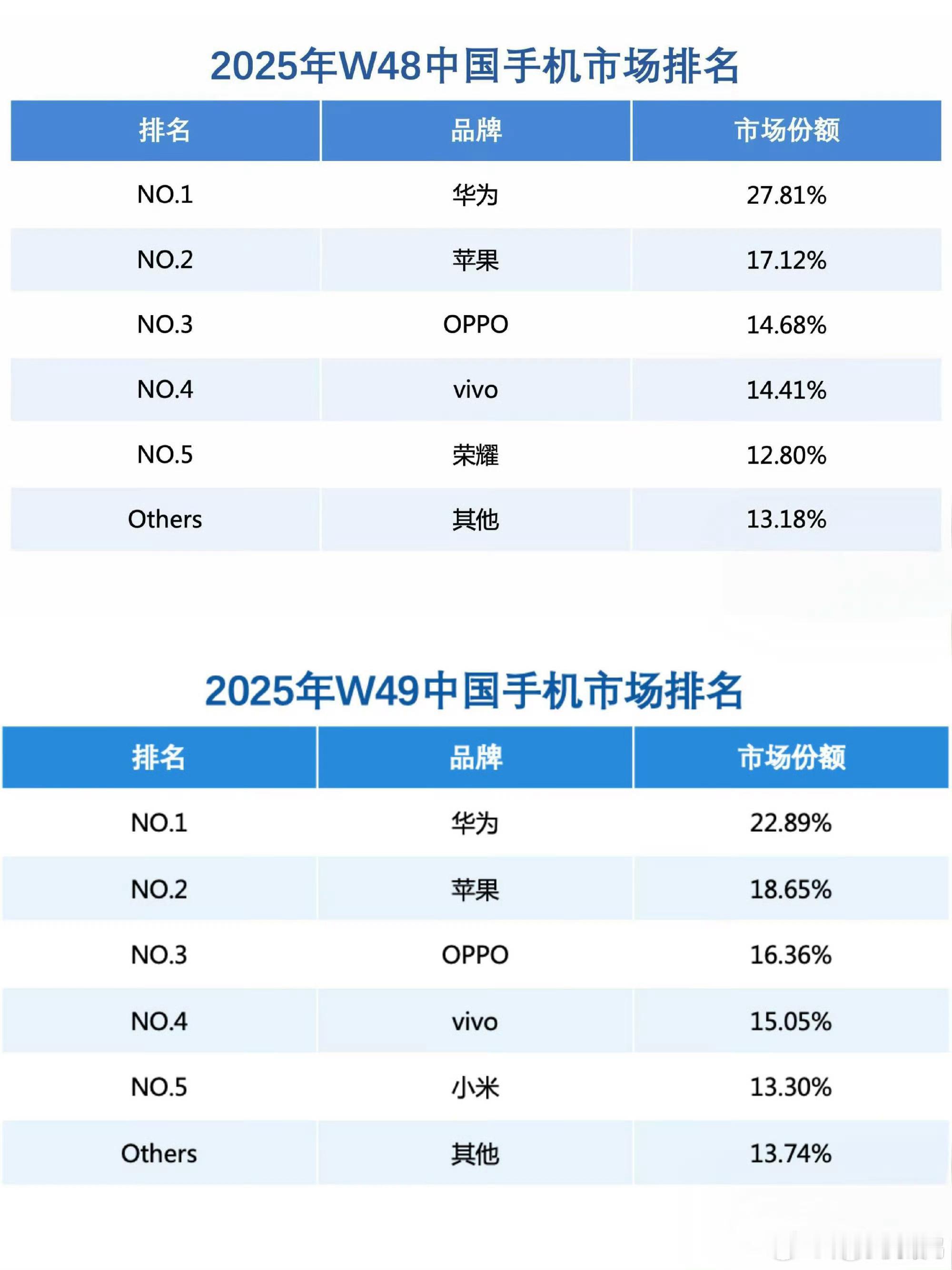 Mate80发布后的W48与W49,华为市场份额重回第一!这是权威机构统计的出货量!比那些野鸡自媒体发的准确多了华为华为手机华为华为mate80 北京