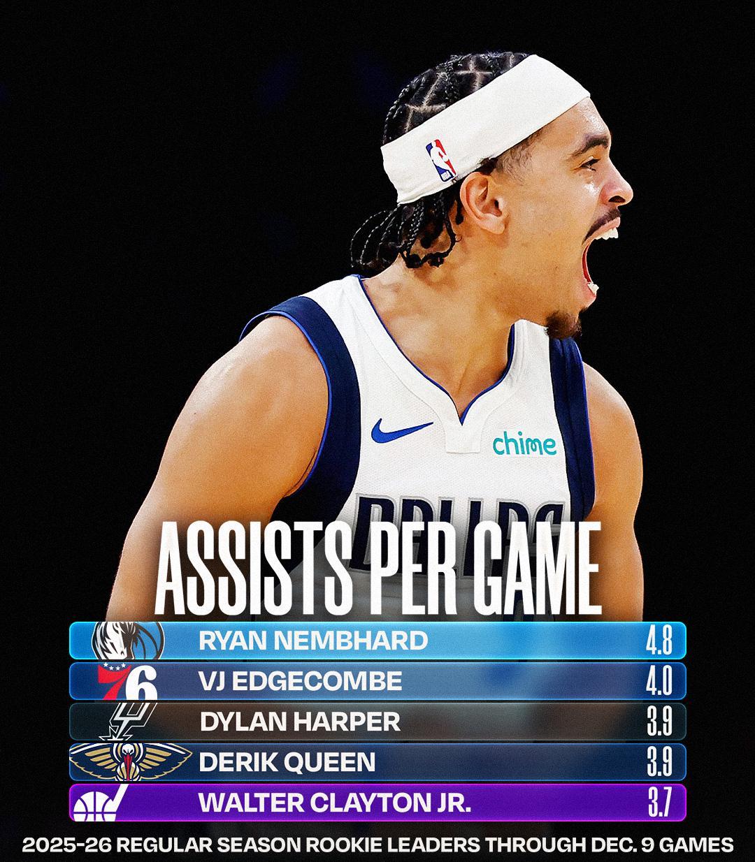 最新一期新秀场均助攻榜,内少目前场均 4.8 次助攻,位列全部新秀的第一位。NB