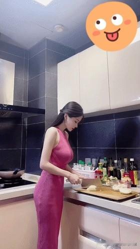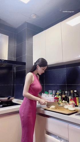 穿粉色连衣裙美女在厨房准备食材,生活与时尚完美结合! 粉色气质连衣裙 嫩粉色连衣裙 穿连衣裙的女人