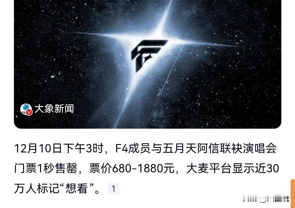 F4成员虽然少了个朱孝天,但是一点也不影响F3的实力,这真是敲响了警钟啊,作为一个艺人要好好说话。 F4成员与阿信演唱会门票1秒售罄。这真的是厉害了。 没有了朱孝天,但是多了一个阿信。 那也是非常有搞头的。