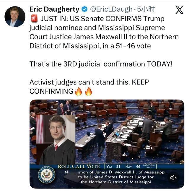 最新消息:美国参议院以51票赞成、46票反对的投票结果,确认特朗普提名的密西西比州最高法院法官詹姆斯·麦克斯韦二世出任密西西比州北区联邦地区法院法官。这是当天进行的第三次司法确认! 特朗普在2025年8月12日提名麦克斯韦二世去填补密西西比北区联邦地区法院的空位,那位置是退休法官迈克尔·P·米尔斯留下的。提名一出,白宫就提交给参议院,司法委员会9月开了听证会。委员会里共和党占多数,他们问了麦克斯韦二世的司法观点,他重申自己是文本主义者。民主党那边则质疑他过去的裁决,尤其是对LGBTQ权利和刑罚方面的立场,说可能影响联邦法院的平衡。 听证结束后,委员会以12比10的党派投票把提名推到全院。本来进展顺利,但北卡罗来纳州的共和党参议员汤姆·蒂利斯卡住了事儿,他要求在国防授权法案里加一条关于卢姆比部落的认可条款,导致提名拖了近两个月。11月20日,蒂利斯终于松口,提名继续往前走。12月9日,参议院全院投票,共和党控制多数席位,但民主党集体反对。投票结果是51赞成、46反对,基本按党派分线,只有少数共和党人投了反对票。 密西西比的共和党参议员辛迪·海德-史密斯发了声明,说麦克斯韦二世是牛津本地人,经验丰富,能胜任联邦法官。这次确认是当天第三次,当天早些时候,特朗普提名的另一个密西西比州最高法院法官罗伯特·钱伯林也以相同票数通过,还有路易斯安那州的威廉·克雷恩也被确认。共和党急着在大选后推动这些提名,目的是巩固联邦法院的保守势力。