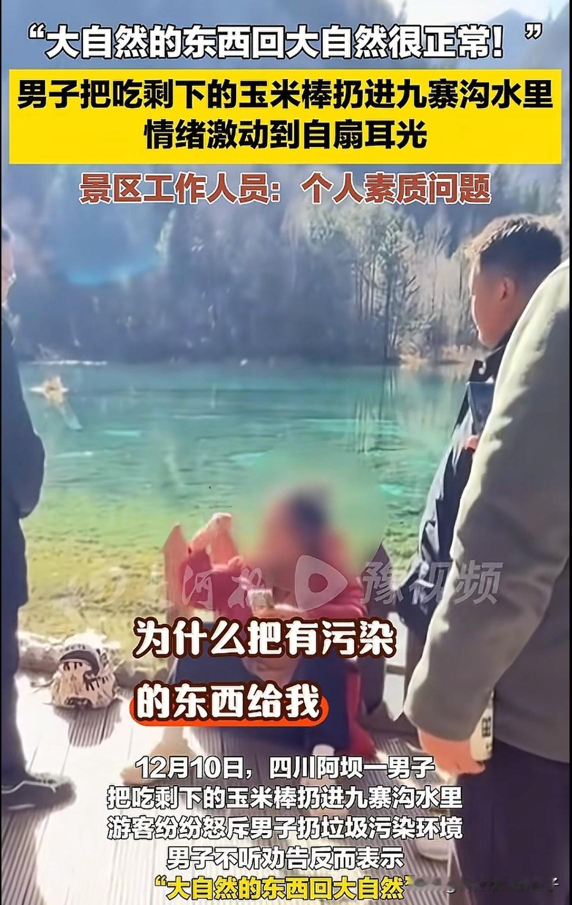 太不讲理了!四川九寨沟,男子将吃完的玉米棒随手就扔进水池里,周围游客指责他不爱护环境,男子不仅没有羞愧,还辩解说大自然的东西就应该回归大自然,他在家也是这样的。 工作人员好心给他讲道理,男子却说如果你们觉得玉米有污染,那为什么还要卖有害的东西给他吃,如果没污染,那他丢到水池里有什么错? 面对男子的胡搅蛮缠,工作人员也拿他没办法! 虽然这东西确实可以分解,但这并不是你乱扔的理由啊,粪便也能自然分解并被植物吸收,但也不代表能随地大小便,更何况这是在景区。 如果来景区的游客每人每天都扔一根玉米,结果会怎么样,估计要不了多久景区就变成辣圾场了,还有人愿意去吗? 对此,您怎么看呢?