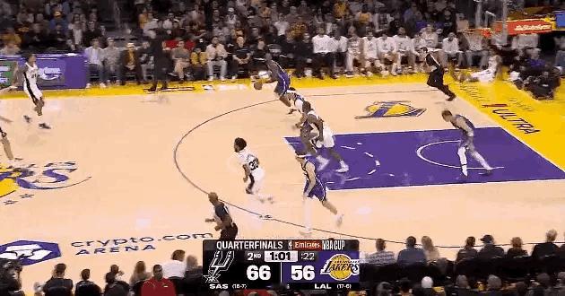这球有多少看直播的直接在屏幕前吼出声来?[祝福][祝福][祝福] 全场都受到这球影响,湖人放弃防守只想赶紧给老詹庆祝,马刺似停非停连续利用小里失误拿分,双方重新拉大到12分差距。 不过观众并不介意,他们只想在此刻把最大的欢呼声送这位41岁的老头,感谢你这么多年的扣篮表演!