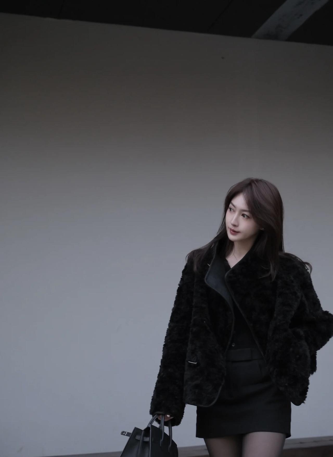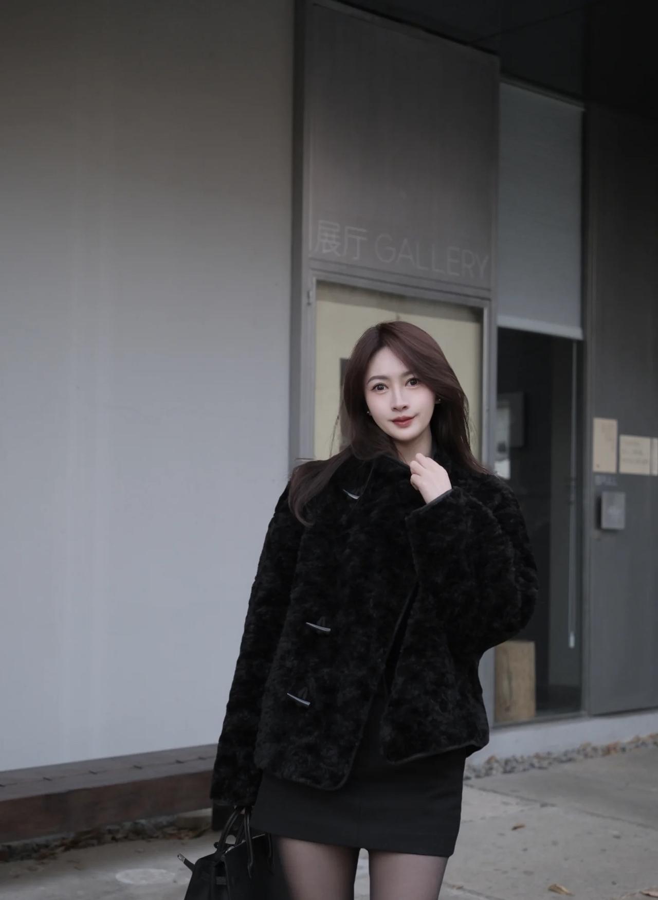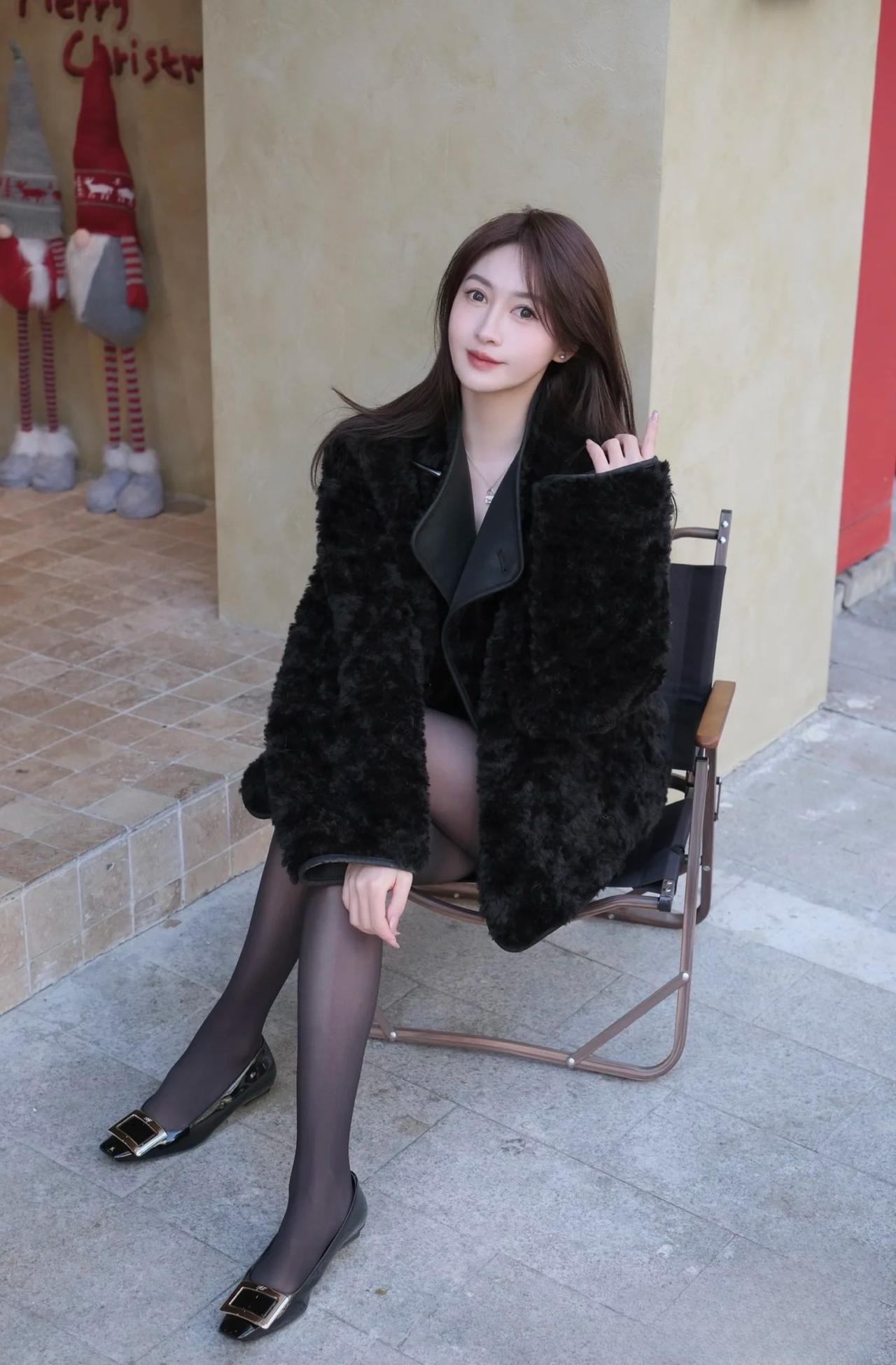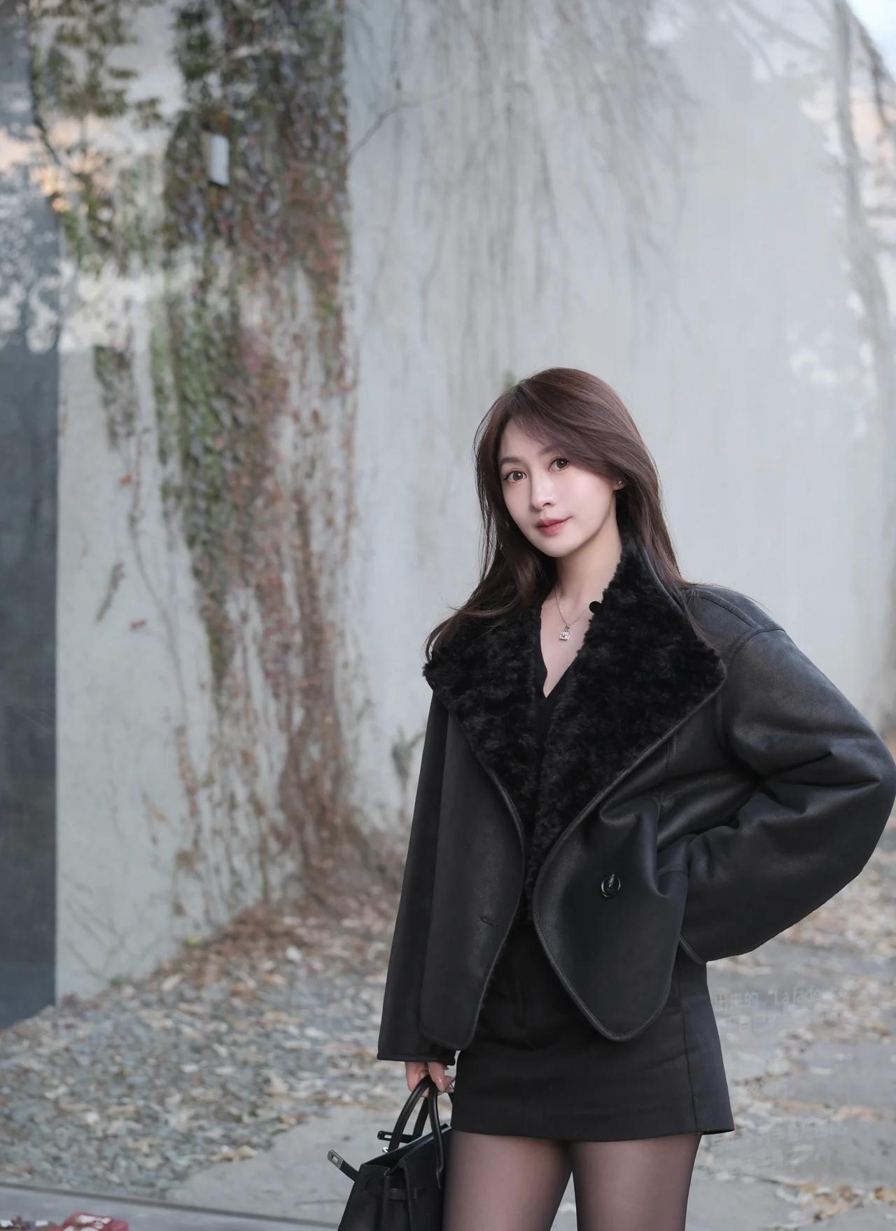 冬日暖阳下,时尚黑皮草外套搭配黑色丝袜和亮面高跟鞋,尽显优雅与魅力。