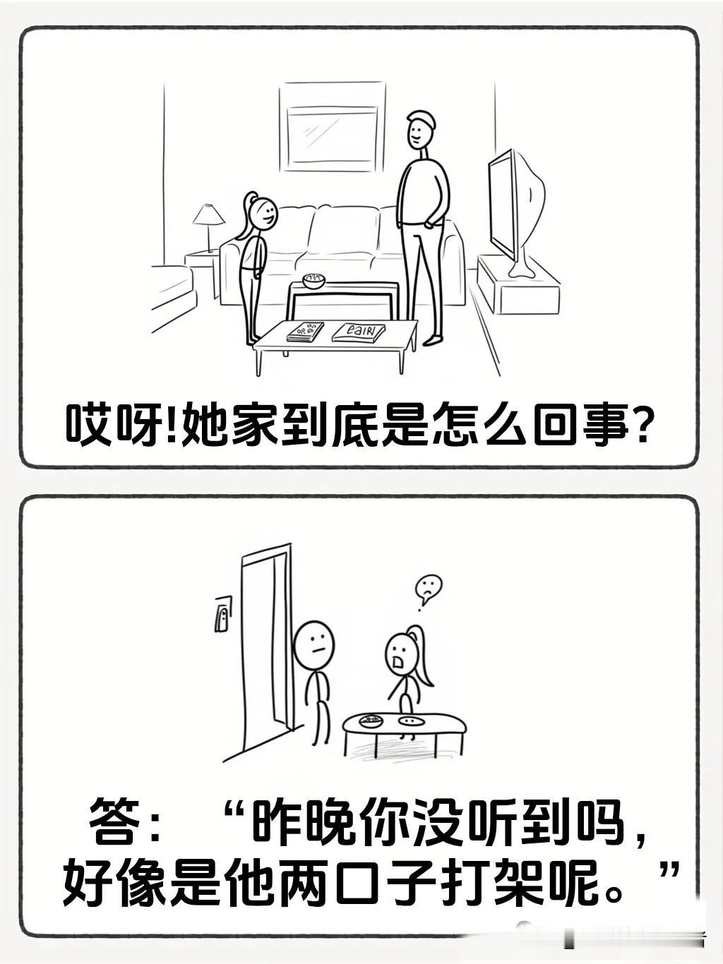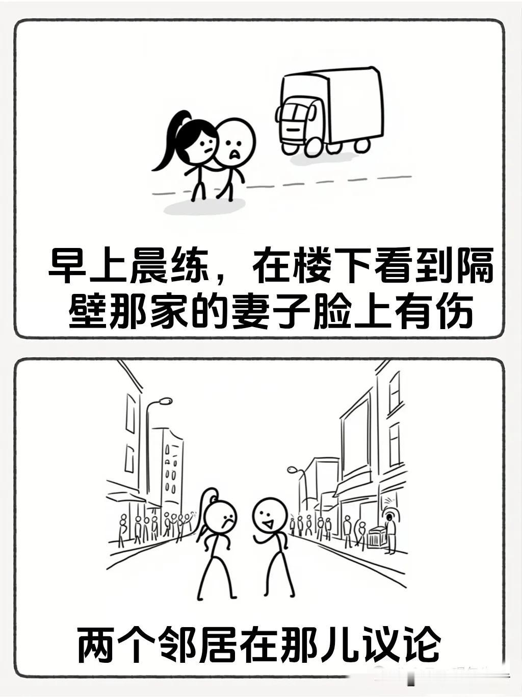 趣味漫画:早上晨练,在楼下看到隔壁那家的妻子脸上有伤,两个邻居在那儿议论:“哎呀!她家到底是怎么回事儿?”答:“昨晚你没听到吗,好像是…