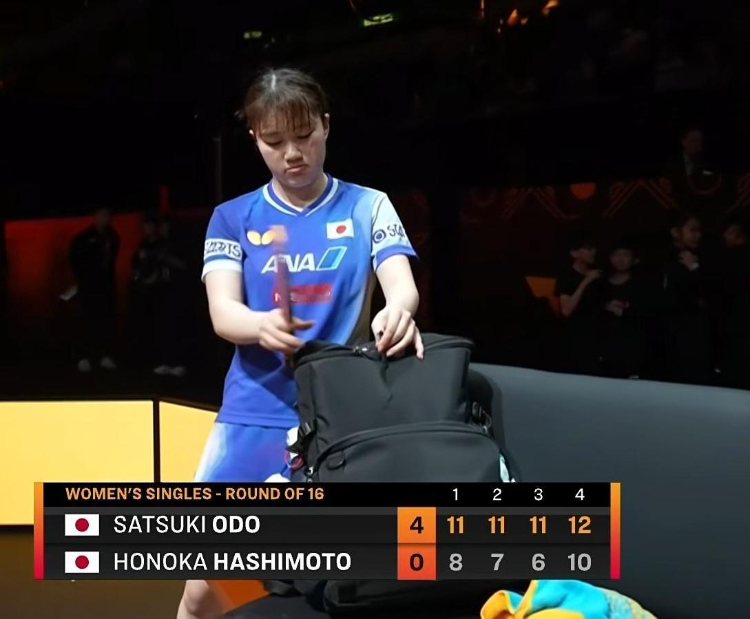 大藤沙月4-0桥本帆乃香 香港总决赛女单16进8,大藤沙月横扫队友轻松晋级。 能打败桥本帆乃香的选手越来越多,有孙颖莎、王曼昱、伊藤美诚等。今天突然发现,大藤沙月打削球一点不费力。 不知道是桥本帆乃香状态差,还是大藤打削球更有心得,反正看起来不吃力,第四局早早桥本就叫出暂停了,9-9打平后,桥本有一个幸运球9-10局点,大藤仍凭借扎实的基本功12-10获胜。