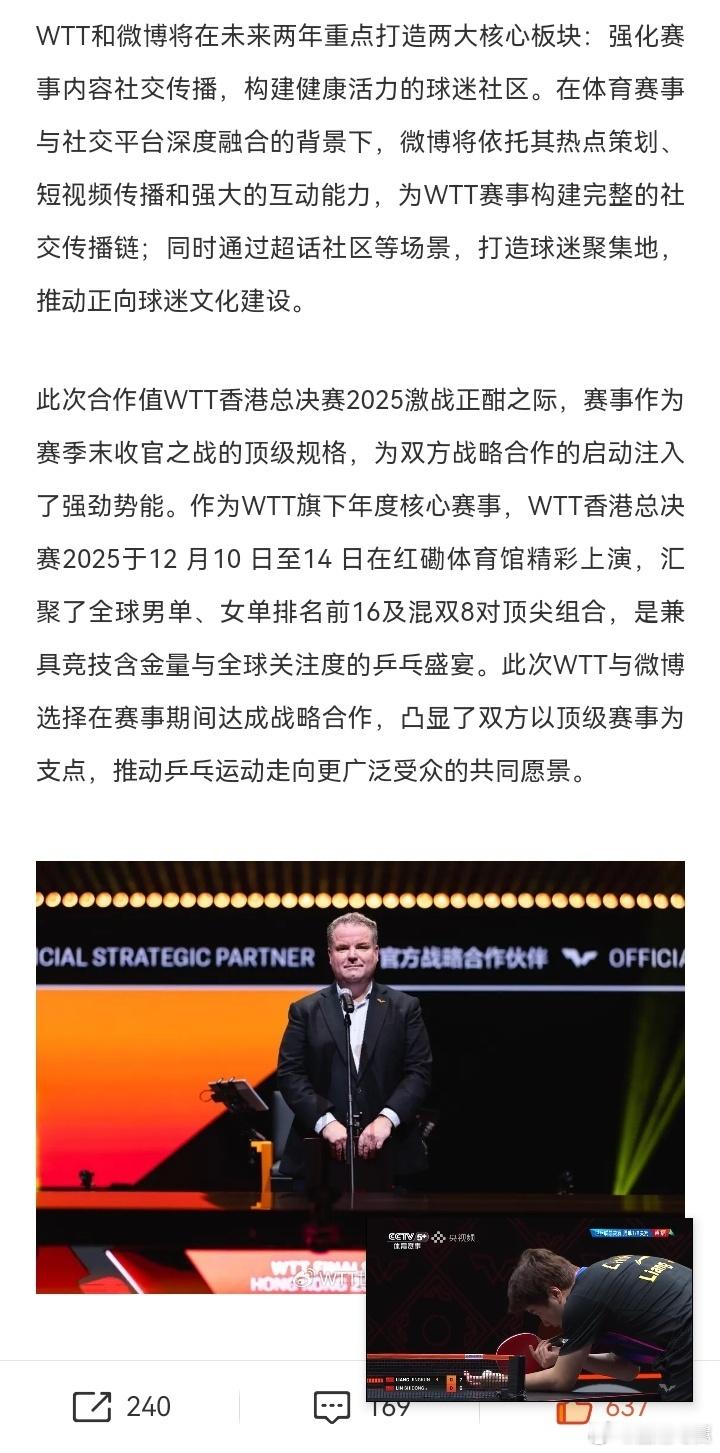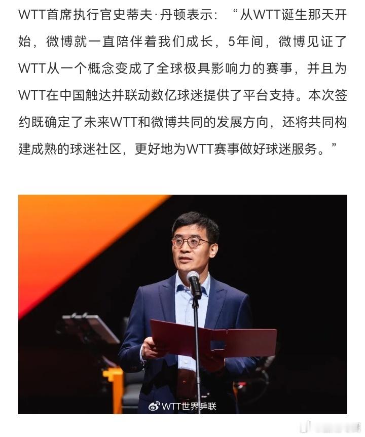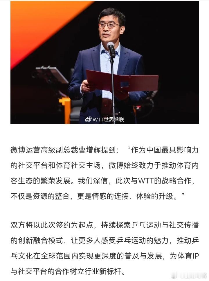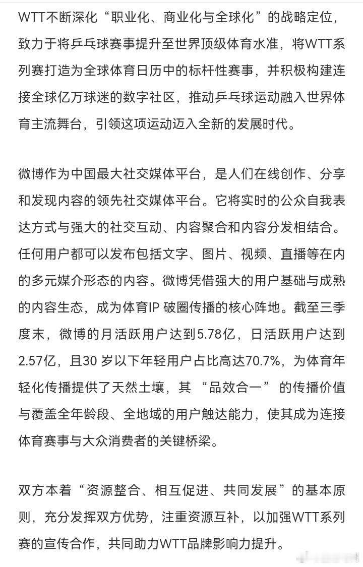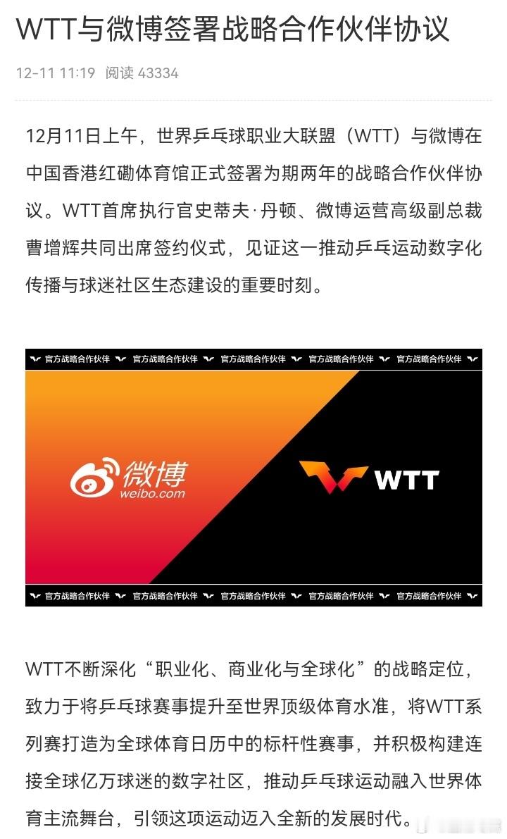WTT与微博达成战略合作 官宣!WTT世界乒乓球职业大联盟与微博正式达成战略合作! 未来,双方将携手为广大球迷呈现更丰富、更即时的乒乓精彩内容,打造全新的互动体验。今天下午15:00,合作开机画面将正式上线,记得来微博一起见证!期待这次联手,能为大家带来更多赛事惊喜、独家幕后与球迷福利。乒乓魅力,尽在微博!