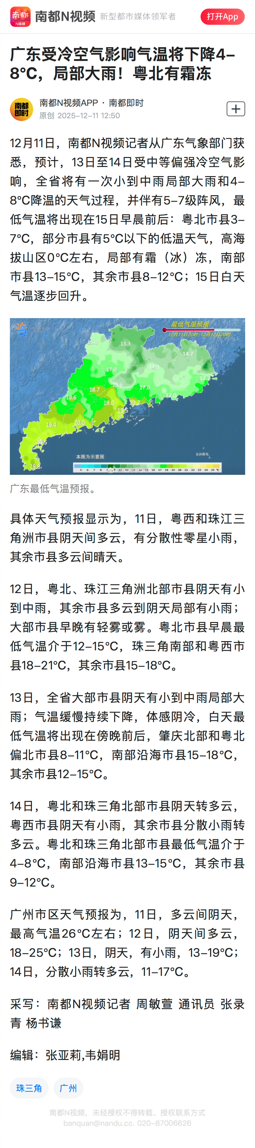 #广东冷空气周末到货# 【广东受冷空气影响气温将下降4-8℃,局部大雨!粤北有霜冻】#广东气温将下降4至8℃#12月11日,南都N视频记者从广东气象部门获悉,预计,13日至14日受中等偏强冷空气影响,全省将有一次小到中雨局部大雨和4-8℃降温的天气过程,并伴有5-7级阵风,最低气温将出现在15日早晨前后:粤北市县3-7℃,部分市县有5℃以下的低温天气,高海拔山区0℃左右,局部有霜(冰)冻,南部市县13-15℃,其余市县8-12℃;15日白天气温逐步回升。南都N视频记者 周敏萱 通讯员 张录青 杨书谦