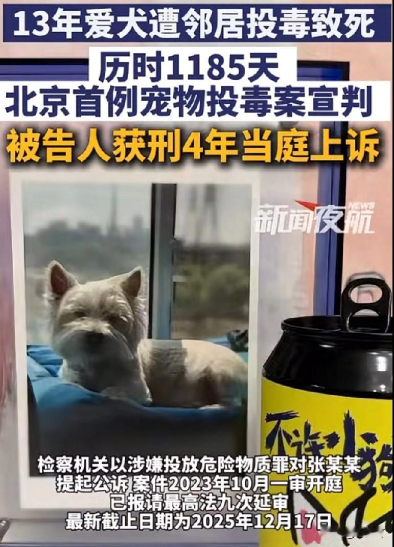 谁都不服,就服北京的这个狗主人李女士。 为了一条被人毒死的狗,李女士竟然辞去原先体面的工作,自学法律,历经了3年时间,终让毒狗者张某华付出了沉重的法律代价。 李女士住在北京,家里有一条养了13年的宠物狗。2023年10份的一天,李女士从小区遛狗回来后,发现这条狗浑身抽搐,狂吐不止,结果还没等到送到宠物医院就一命呜呼了。 看到养了多年的爱犬突然死了,李女士悲痛万分,她更怀疑有人在小区里故意投放有毒食物导致狗的死亡。 李女士后来得知,被毒死的不只她家一条狗,还有9条狗和两只流浪猫。 后来,李女士联同其他宠物主人报了案,警方很快锁定了投毒者是同小区业主张某华。他把一种叫做氟乙酸钠的农药故意投放在了小区里,导致多只宠物死亡。 为了能让张某华付出法律代价,李女士一边自学法律,一边奔走于法庭。她要求检察机关以投放危险物质罪对张某华提起公诉,从2023年10月份开庭,已经报请了最高人民法院9次延审。 可以说,李女士为死去的狗讨回公道,付出了正常人难以想象的时间和精力。也正如她所说,因为这件事情,她的人生轨迹都变化了。 在李女士坚持不懈的状告下,2025年12月份,北京市某法院一审认定张某华构成投放危险物质罪,被判处有期徒刑4年。 看到这样的判决结果,李女士自然是非常欣慰。因为她3年多的付出没有白费,这场官司她胜出了。 但是,张某华却对判决结果表示不服。当法官问他对于这样的判决是否同意的时候,他当庭表示一定要上诉! 为了一条死去的狗,打了3年官司。结果被告人不服判决想要上诉,看来,李女士的官司到此还划不了句号,她还得和张某华较量下去。 可是话又说回来,仅为了一条死去的狗,这么做真的值得吗? (信息来源:新闻夜航)