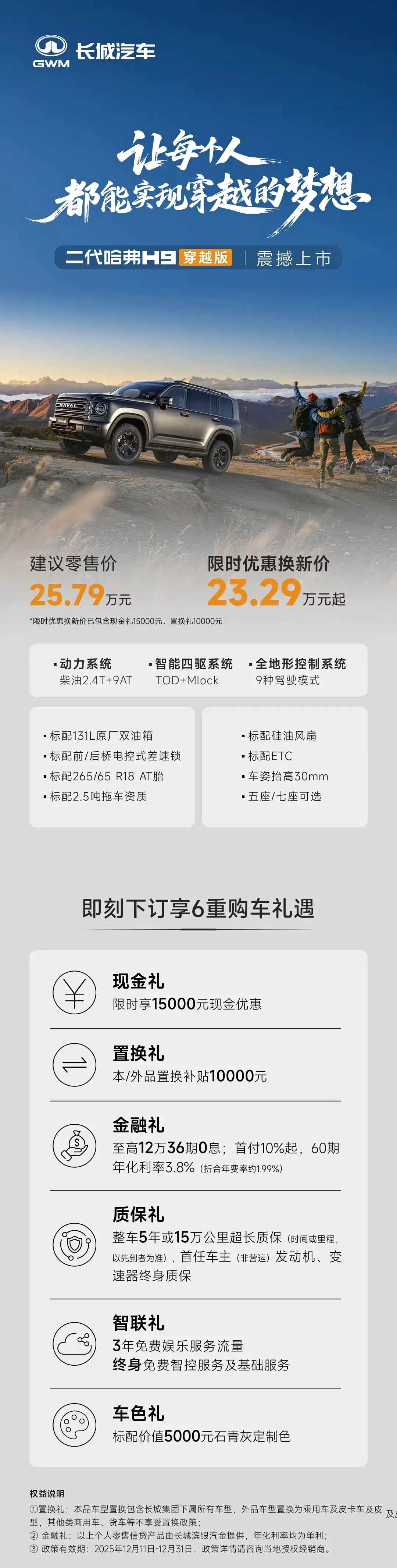 12月11日,哈弗H9越版正式上市,该车官方指导价为25.79万元,限时优惠换新价23.29万元,购车可享6重礼,包括现金礼(15000元现金优惠)、置换礼(置换补贴10000元)、金融礼(12万36期0息等)、质保礼、智联礼和车色礼。 动力方面,新车依旧搭载2.4T柴油发动机,最大功率137千瓦,峰值扭矩490牛·米,标配硅油风扇并配备131L原厂双油箱,续航可达1400km。传动系统匹配9速自动变速箱,前后桥电控限滑差速锁、博格华纳TOD适时四驱系统,其提供9种驾驶模式,其中新增岩石模式和专家模式,另外还具备2.5吨拖车资质。