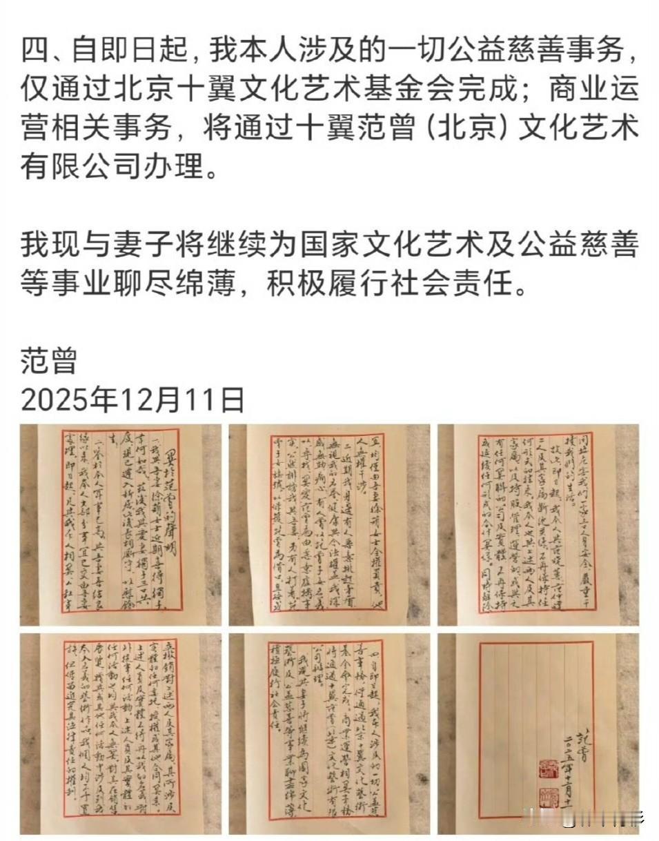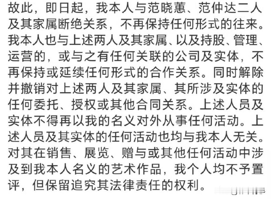 87岁书画大师范曾宣布与女儿继子断绝关系!个人事务将移交37岁第四任妻子,疑似家族“内斗”白热化! 消息来源:国内社交平台 12月11日87岁书画大师范曾突然在其个人社交账号发文,宣布与亲生女儿范晓蕙、继子范仲达及其家属断绝关系,并高调宣布与37岁第四任妻子徐萌“喜得独子”,同时他还宣布将个人事务全权移交给他的妻子处理! 疑似家族“内斗”白热化! 今年8月范曾曾陷“失踪”罗生门,当时他的亲生女儿范晓蕙在其社交平台发文控诉自己父亲失联,其住所内价值20亿古董遭分批转移,老员工全部被封口辞退,范晓蕙将矛头直指范曾第四任妻子徐萌! 财产争夺暗战! 不仅发文控诉,范晓蕙还指控徐萌与范仲达勾结,低价倒卖范曾字画获利超2亿! 舆论争议焦点! 目前网络上对于此次范曾发声存在较大的争议,有网友质疑87岁高龄的范曾是否是自主发布声明,也有网友表示对87岁高龄能“喜得独子”存在疑惑! 目前在法律上父母子女关系无法单方解除,但经济授权及财产分割声明有效,对于此事件后续发展,估计难免会上升到司法程序阶段!