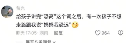 给孩子讲完“恐高”这个词之后,有一次孩子不想走路跟我说“妈妈我恐远”