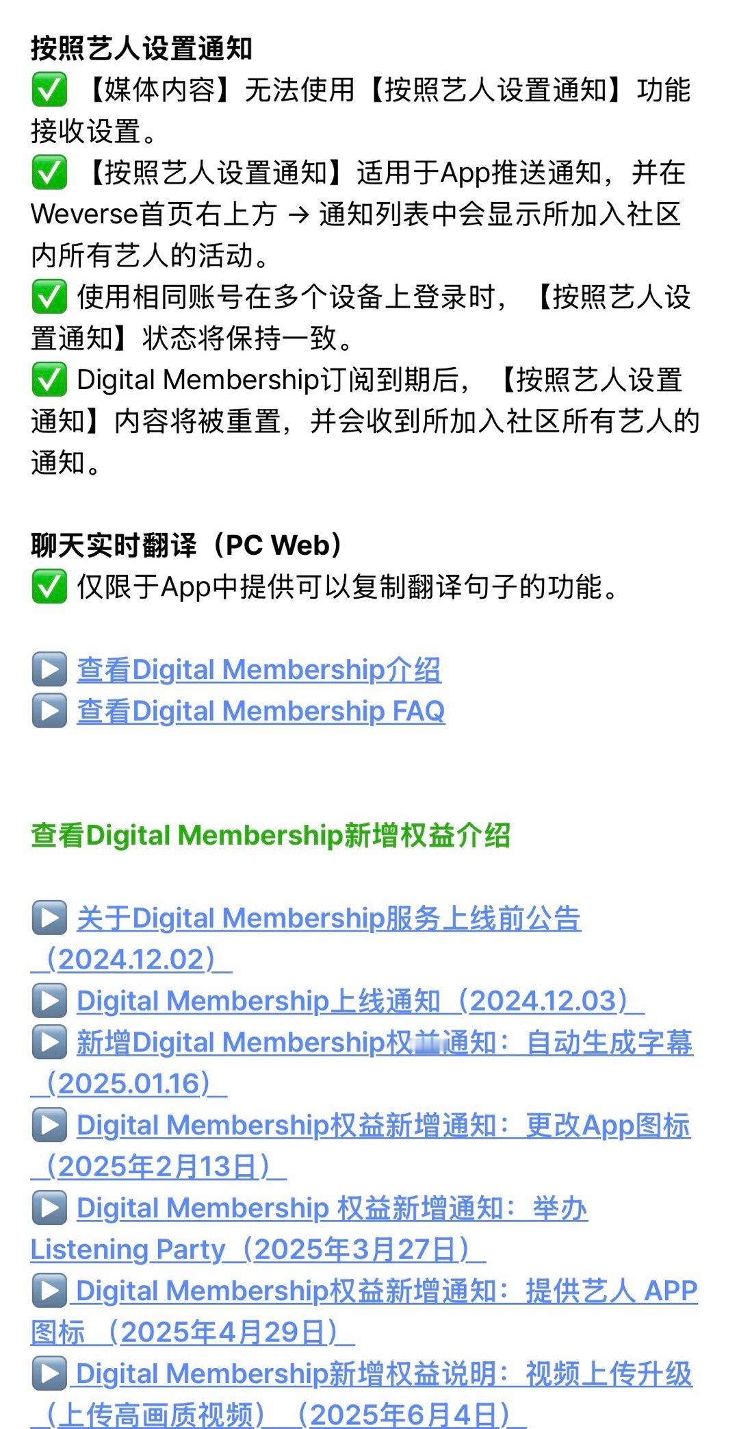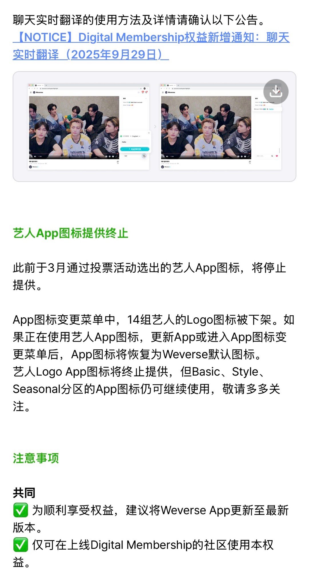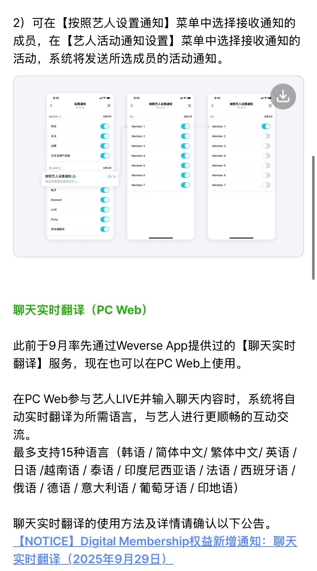 Weverse电子会员权益更新:新增按成员设置通知、聊天实时翻译等功能🆕