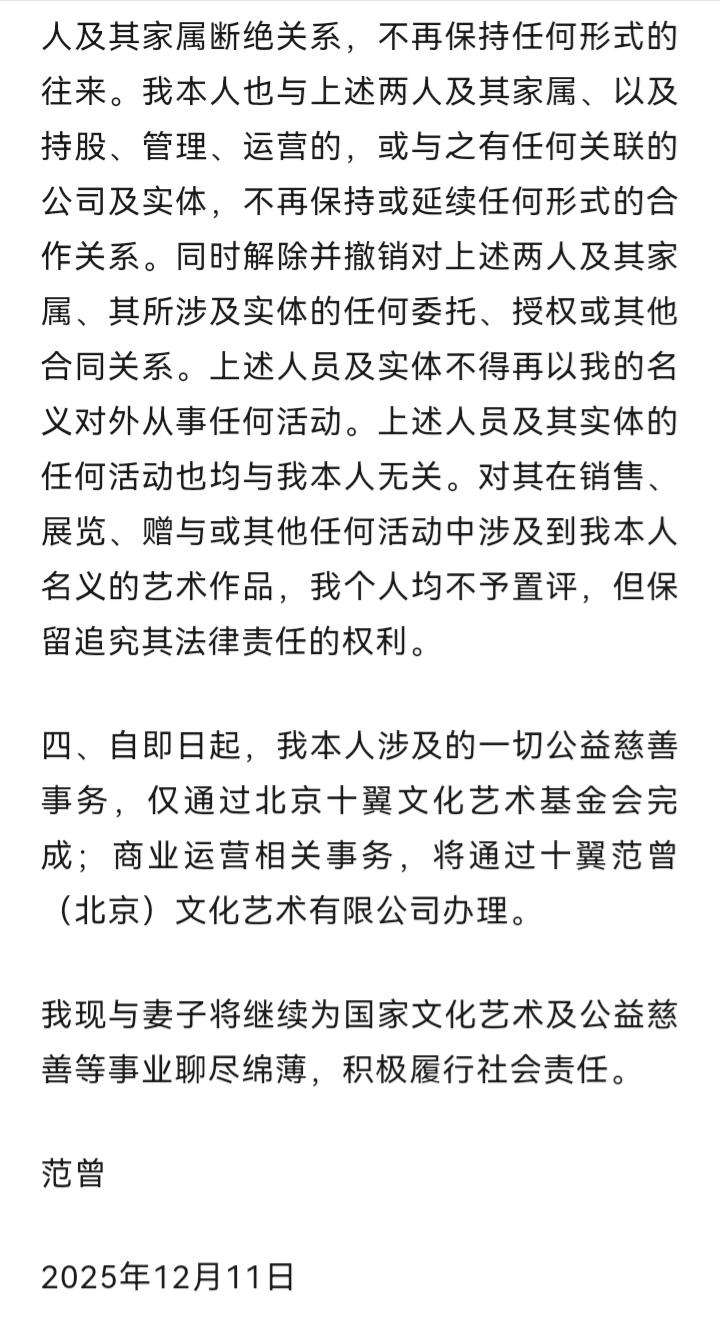 画家范曾又把自己“炒”火了! 国画大师范曾今日在微博上发表声明,表示与其子女范晓蕙、范仲达及他们的家属断绝一切关系。并终止与他们的所有商业合作。 此前,其女儿范晓蕙曾称范曾“失联”,并指责了范曾之妻徐荫。 自我感觉良好的范大师公开发表这一声明,又将把自己“炒”火一把,名气越来越大,名气比画作还大! (附范曾声明全文) 图片. 87岁的范曾与娇妻徐荫。