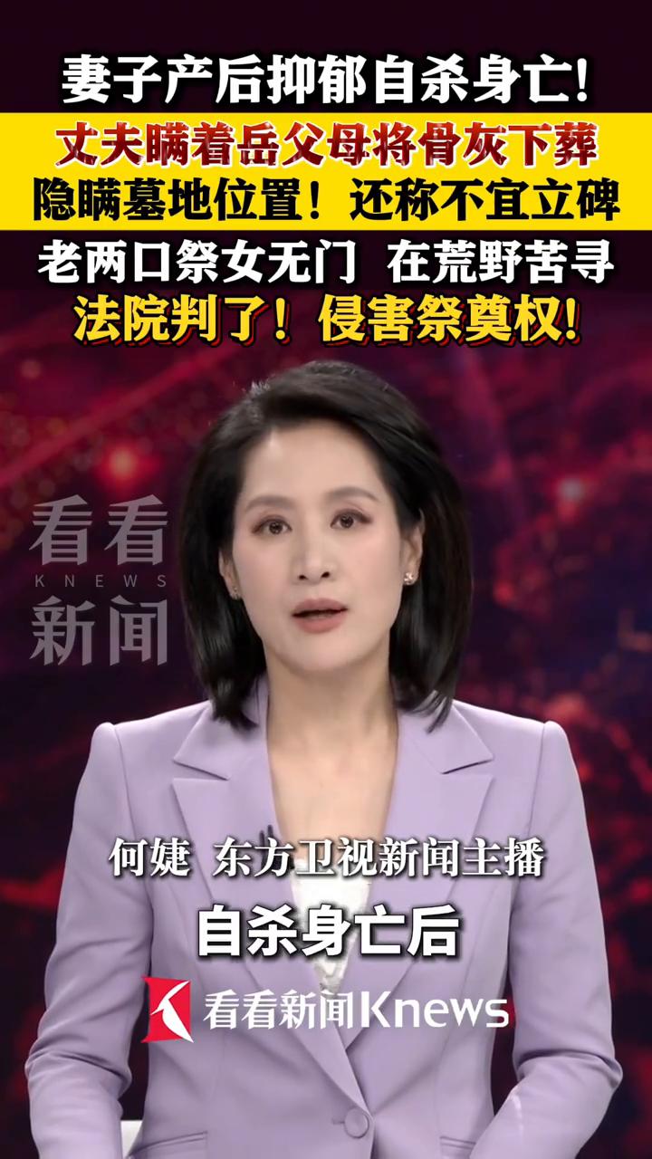 妻子产后抑郁自杀身亡,丈夫瞒着岳父母将骨灰下葬,隐瞒墓地位置,还称不宜立碑。老两口祭女无门在荒野苦寻,法院判了,侵害祭奠权。 东方卫视新闻主播何婕。 妻子产后抑郁自杀身亡,丈夫却不肯透露墓地位置,岳父岳母四处寻找,无处祭奠。2021年,妻子小宁因产后抑郁自杀身亡后,丈夫刘先生瞒着岳父岳母将妻子的骨灰带回了河北老家安葬。老夫妻白发人送黑发人,女儿骨灰还不知去向,伤心气愤之余,一纸诉状将女婿告上法庭。 法院以侵害祭奠权为由,判决刘先生告知墓葬地。判决之后,女婿虽提供了墓地定位和照片,但因坟头无墓碑,导致老人始终无法找到。刘先生说这是当地风俗,不适合给妻子立碑。民间有个传言,横死之人不立碑。 2024年底,在法院多次协调之下,刘先生终于同意将小宁的骨灰迁入了县城公墓。小宁的父母终于不用在荒草野地中寻找女儿墓地。