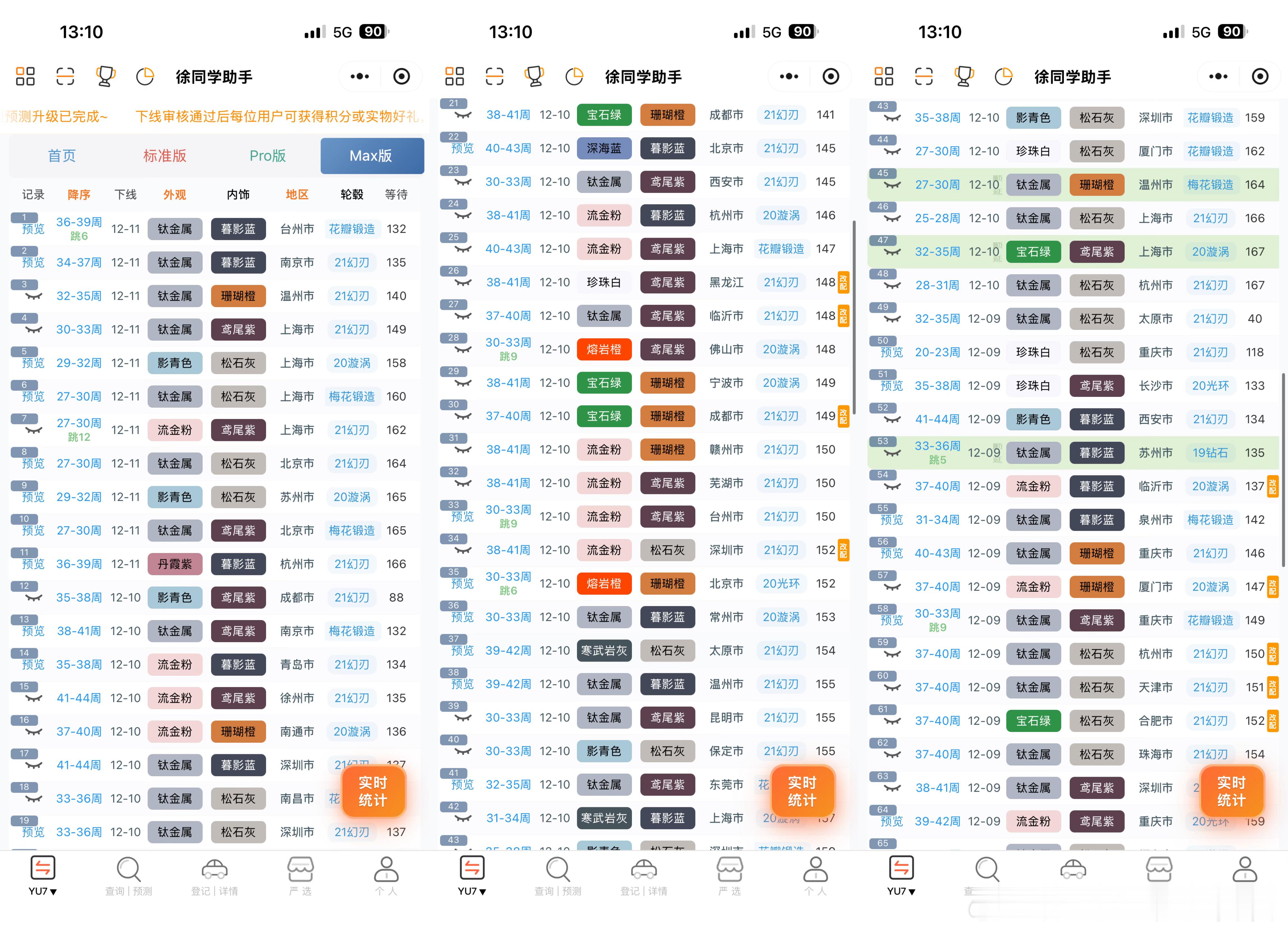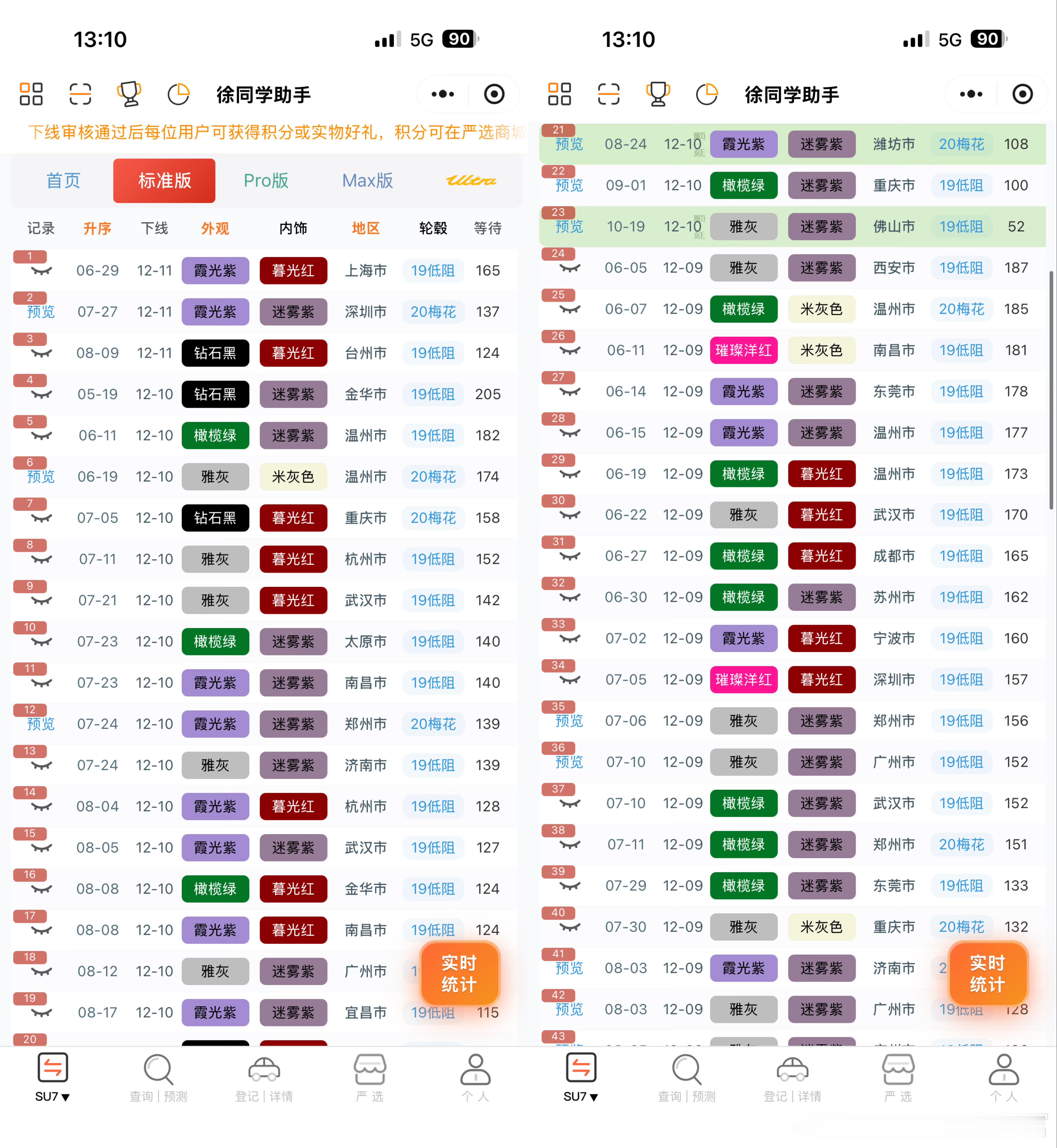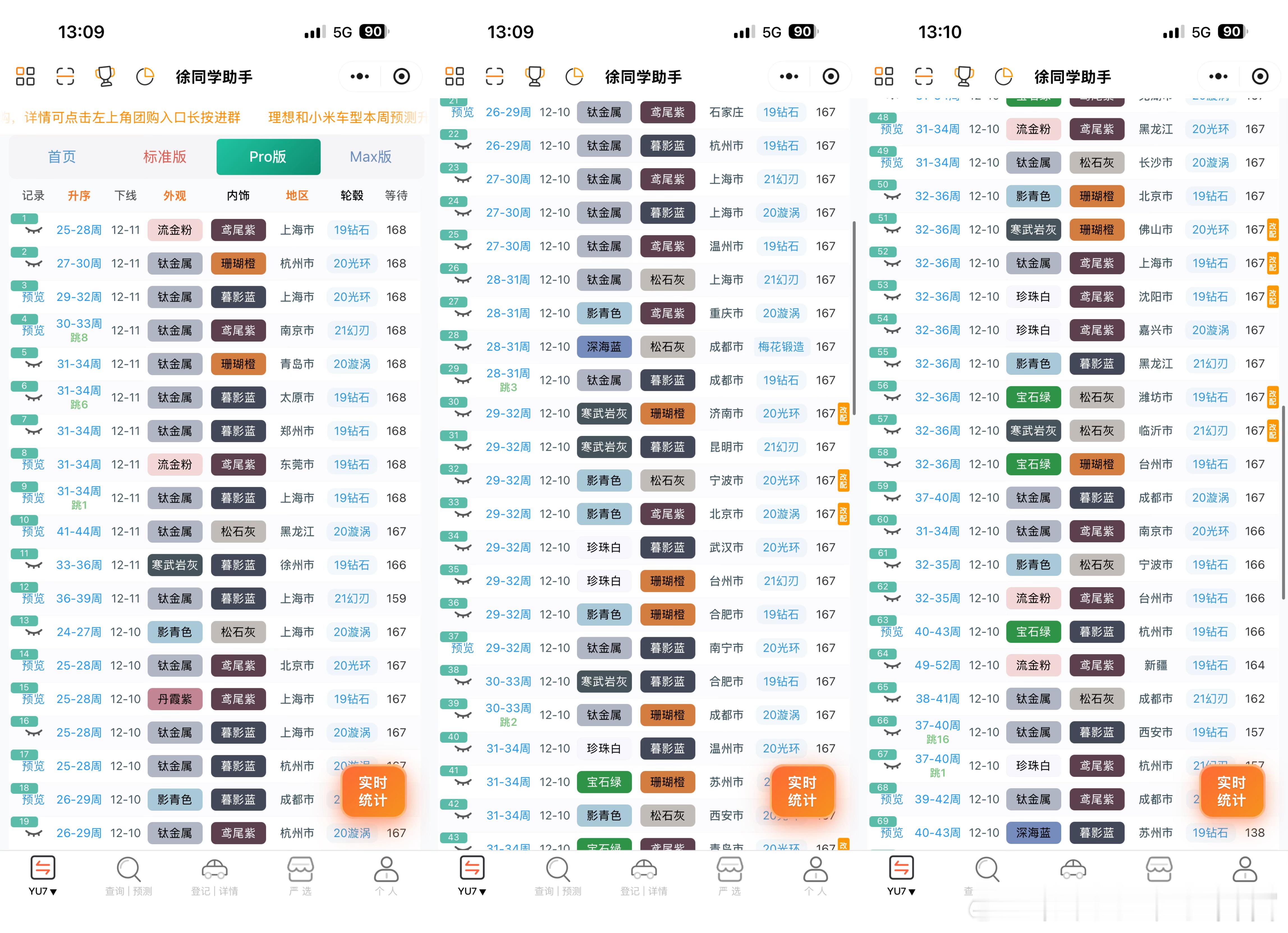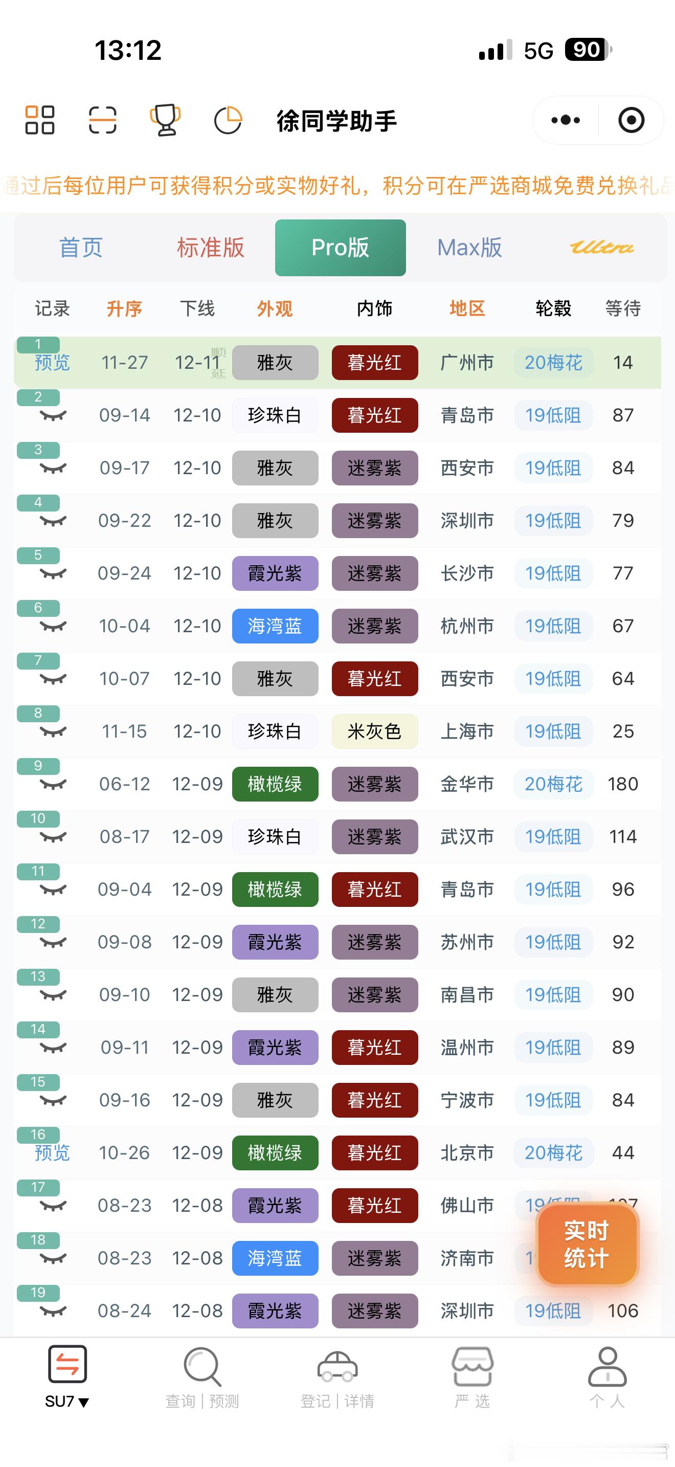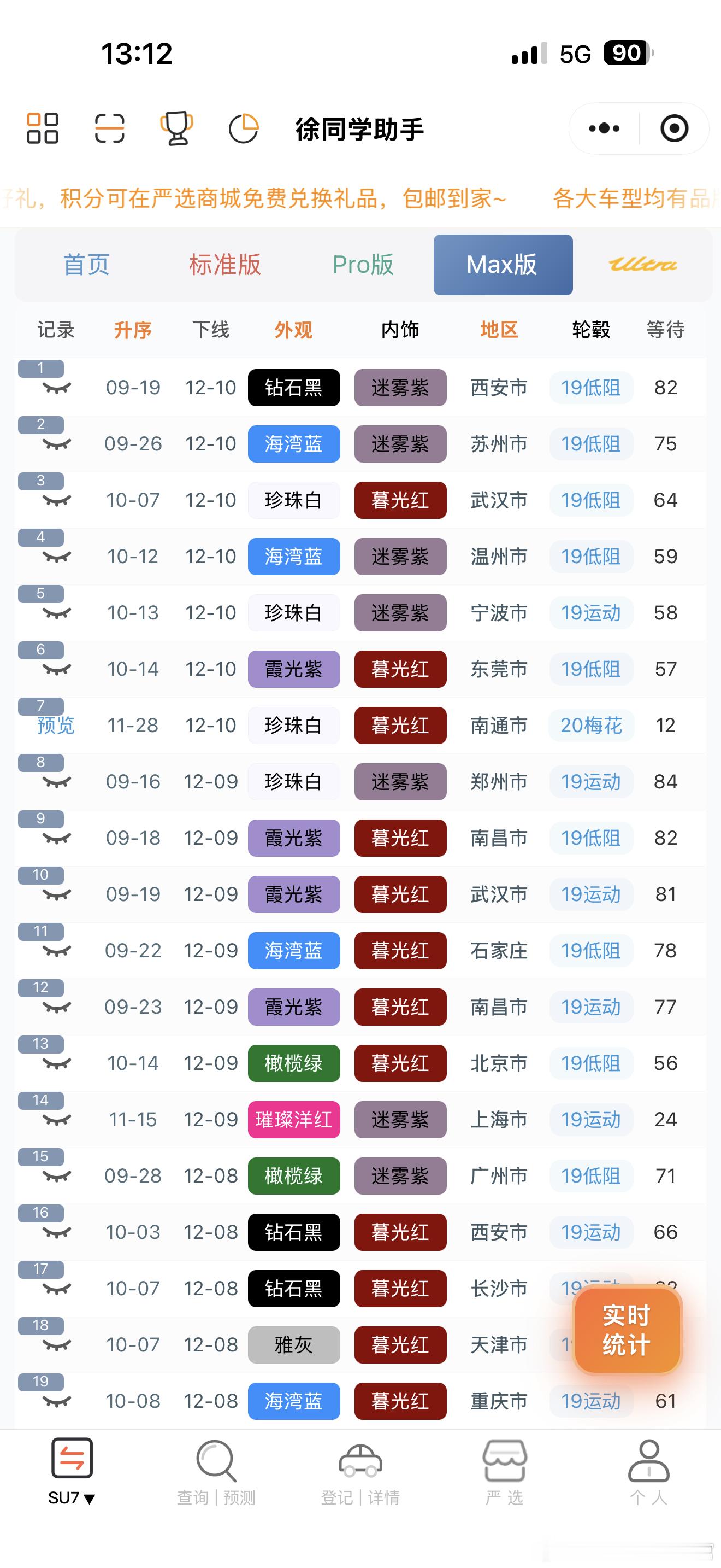 小米汽车(12月11日)下线实况每天早上还会断断续续的有现车放出来,想早提车可以蹲一蹲,不过标准版和pro一般抢不到🌀YU7(据不完全统计)合计223台1️⃣标准:下线129台,好多26-28周左右的在下线,居然还有0-3没下线的,但是7月的也有下线2️⃣Pro:下线57台,又有31周的左右的了,基本都是26号晚上11点多的在下线,当天的今年应该能交完3️⃣Max:下线37 台,稀有色很多,从6月底到7月底的都在陆续下线,现车还不少(带碳纤维套件的算是性价比最低的了)🌀SU7(据不完全统计)合计34台1️⃣标准:下线20台,在陆续下线剩余3-6周的订单2️⃣Pro:下线7台,11月的随时下线3️⃣Max:下线7台,11月还有少量订单4️⃣ultra:无月底很多地方没有补贴了,倒是可以安心等1月了,总会有新政策刷新的更多关于小米汽车的最新资讯和深度解析,请参考【米车派】~徐同学助手小米汽车
