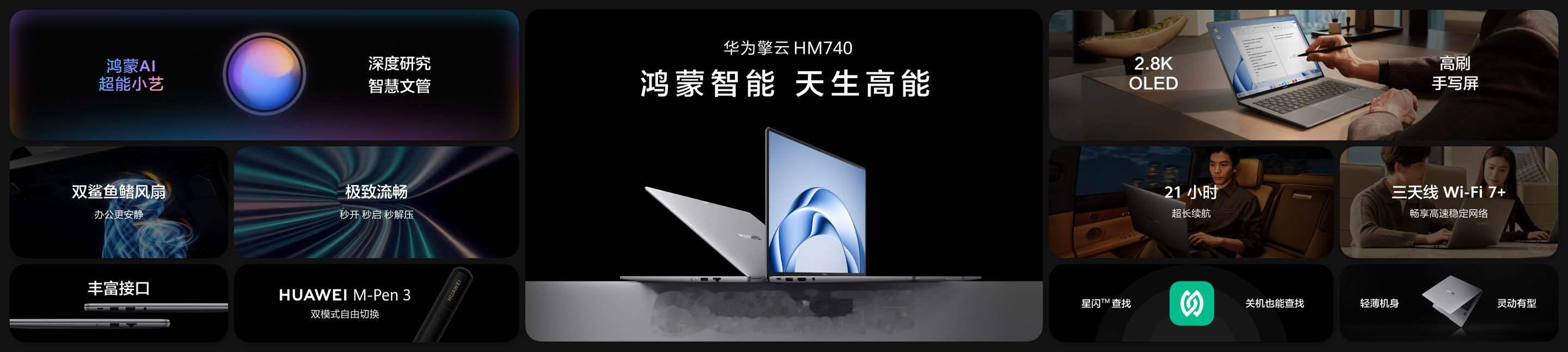 新一代鸿蒙电脑发布华为擎云 HM740正式亮相,面向政企移动办公打造“续航最强”的鸿蒙电脑:70Wh大电池带来最长21小时本地视频播放、15小时语音会议,以超长续航覆盖全天多场景使用。机身提供全面接口,扩展更从容。同时配备2.8K 120Hz OLED旗舰屏,高色域、高亮度与专业护眼兼备,并支持 HUAWEI M-Pen 3 多功能笔,满足金融、能源、政务等行业的专业创作与办公需求。依托系统到生态的全链路自主可控,华为擎云 HM740正在为关键行业打开新一代高能生产力体验。