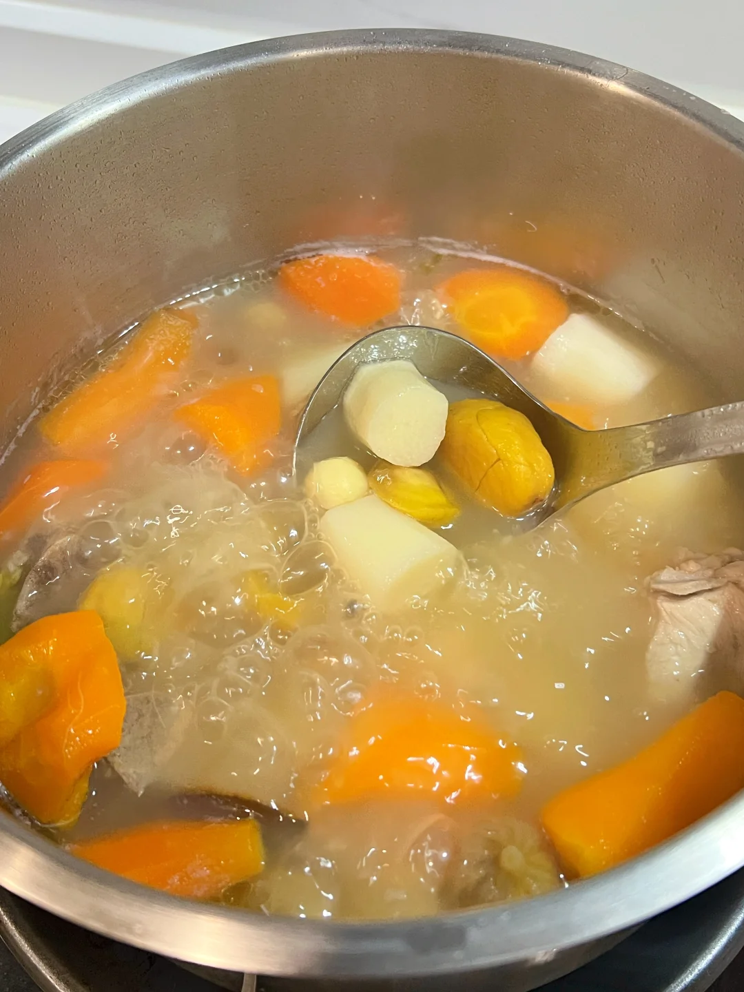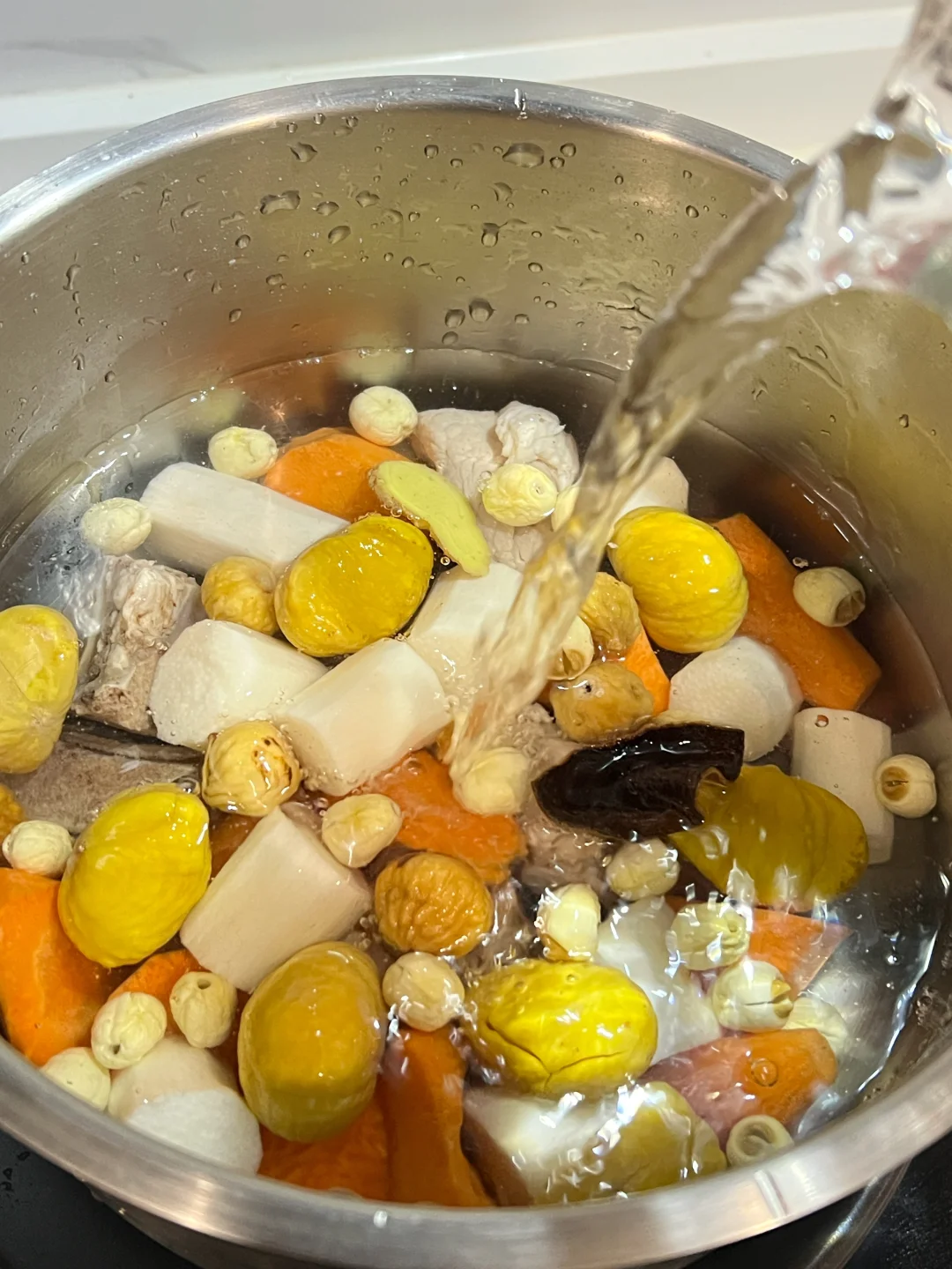 2️⃣将所有食材放进锅中,加1500毫升清水,大火烧开后,小火煲一个小时,放盐调味即可。