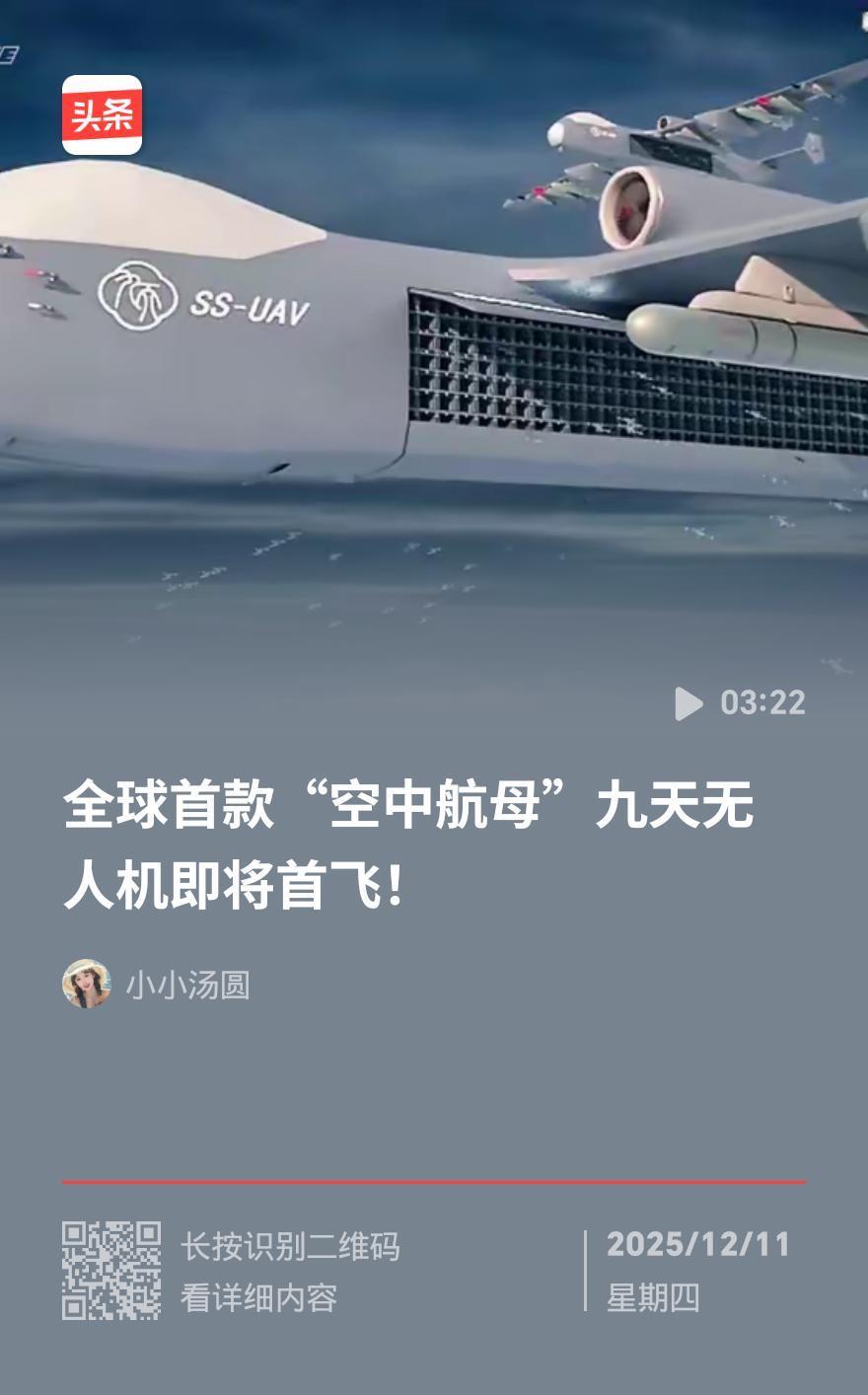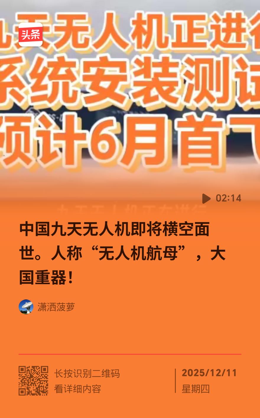 大国重器!中国“九天”无人机首飞 空中航母兼顾军民两用 2025年12月11日,中国无人机领域迎来高光时刻。被称为“空中航母”的大型无人机“九天”成功首飞,各项核心性能指标跻身世界前列,一举成为名副其实的国之重器。 这款无人机堪称空中的“超级蜂巢”,机身搭载的“异构蜂巢任务舱”暗藏玄机。和平年代,它是服务民生的多面手。偏远山区的物资运输、受灾区域的快速测绘,都能见到它的身影,像不知疲倦的空中信使,为需要的地方送去及时支援。 一旦进入战时状态,它便摇身一变成为战场利刃。任务舱可一次性释放上百架小型无人机或巡飞弹,在空中织就一张密不透风的“智能杀伤云”。这般饱和式打击的威力,足以让任何对手忌惮。 民用领域大显身手,战场之上威慑十足。“九天”无人机的横空出世,既彰显了中国航空工业的硬核实力,也为国防安全和民生发展添上了浓墨重彩的一笔。 你觉得这款“空中航母”未来还能解锁哪些新用途?