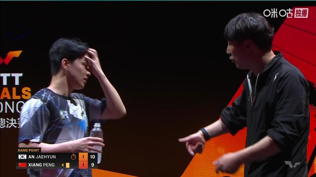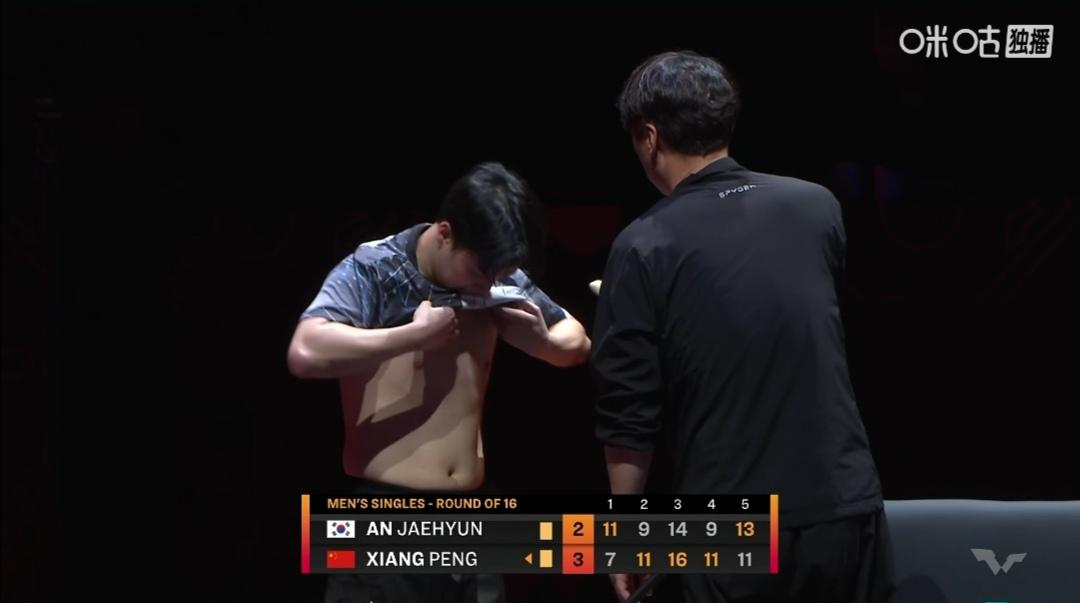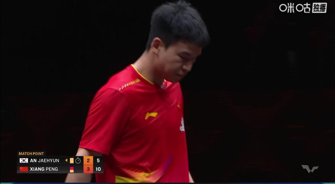 向鹏的喜和忧! 小将向鹏首次参加WTT总决赛,1/8决赛对阵韩国安宰贤。 向鹏敢打敢拼,4:2(7-11;11-9;16-14;11-9;11-13;11-5)大胜韩国安宰贤! 恭喜向鹏晋级单打八强! 喜事一桩! 忧心的事 1/4决赛,面对单打世界排名第二、队友小石头林诗栋,胜负难料! 向鹏和安宰贤都被罚黄牌! 但向鹏还染红了! 我没看到是何因? 不过向鹏得分后,尤其是关键得分后,喜欢转圈跑!