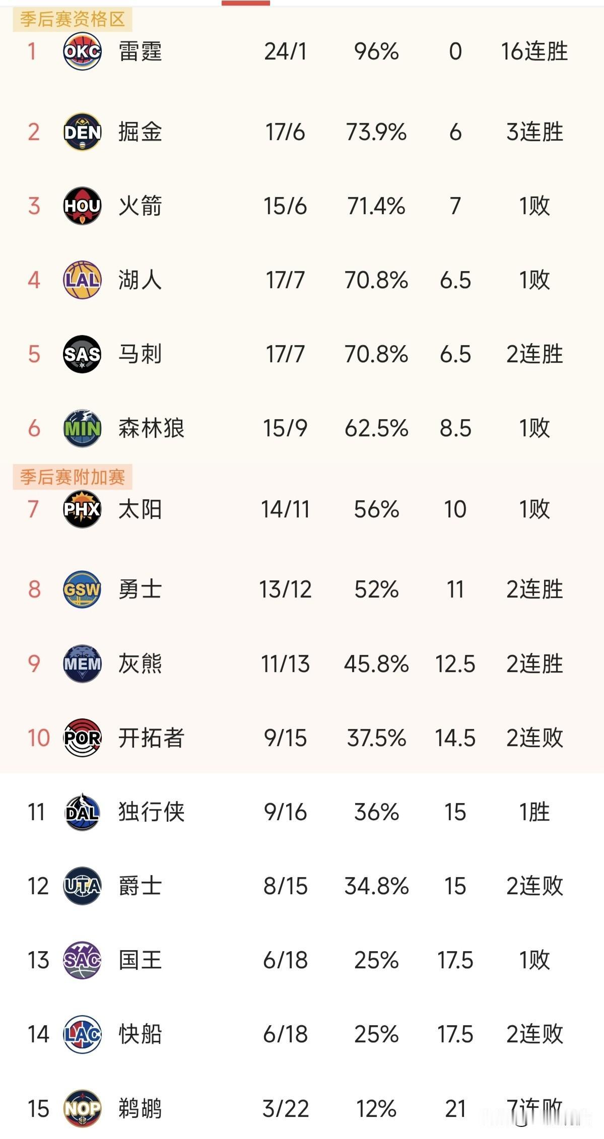 雷霆有16连胜了,24胜1负追平曾经的73胜勇士,已经领先西部第二掘金6个胜场,掘金和湖人不要掉队太多呀,不然MVP之争约基奇和东契奇直接没有机会了。最近几天因为NBA杯比赛少,明天开始又要多起来了,影响排名的比赛会更多。