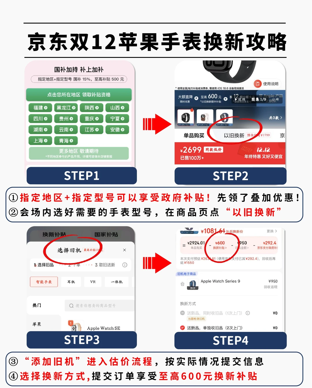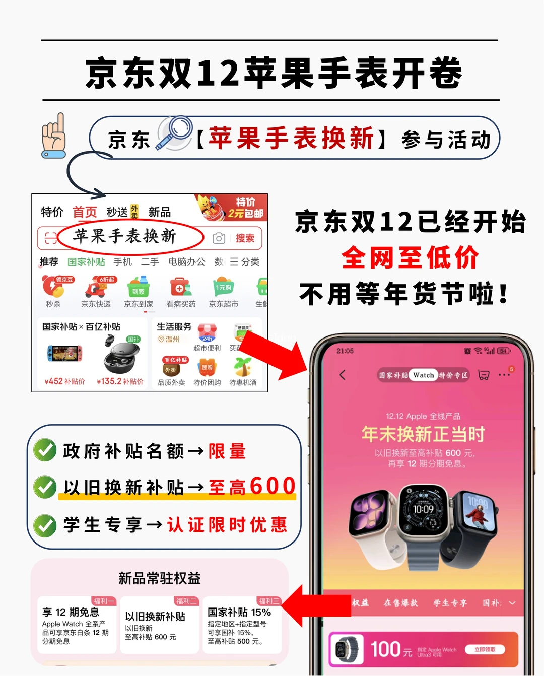 京东直接🔍“苹果手表换新”,进活动页面,领券后选型号,有10%政府补贴就先领了💸,这个是真限量,千万别错过!然后在商品页勾“以旧换新”估价(至高600元),确认补贴是否叠加,最终价才是真实到手价,同时还有 12期免息,压力更小