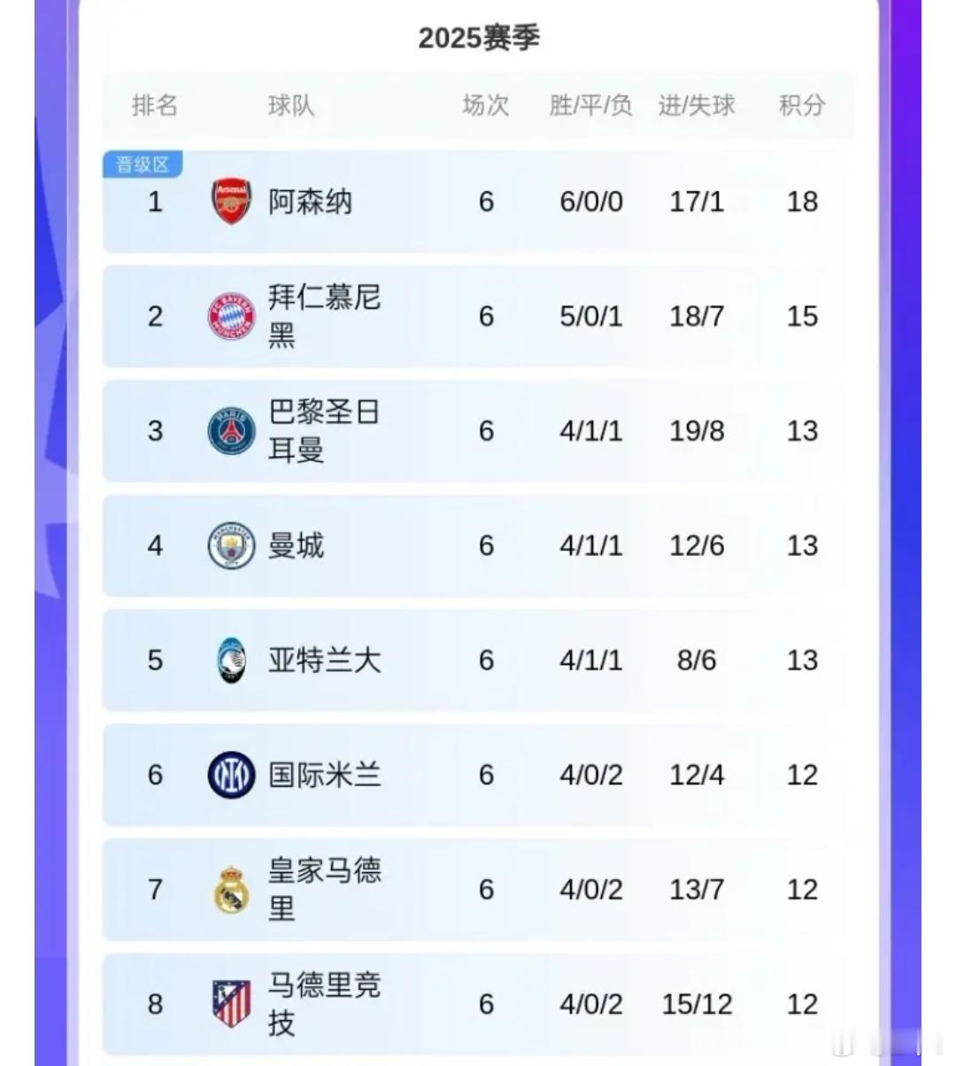 逆转+全胜!曼城掀翻皇马,阿森纳6连胜,欧冠晋级形势大洗牌欧冠联赛阶段第六轮战罢,多场关键对决结果出炉。皇家马德里在主场不敌曼城,尤文图斯与阿森纳则分别以完胜稳固排名,巴黎圣日耳曼、多特蒙德和勒沃库森均与对手战平。本轮赛事过后,联赛制的晋级形势渐趋明朗。在伯纳乌的强强对话中,皇马尽管控球占优,却以1-2不敌曼城。罗德里戈为主队先拔头筹,但曼城凭借奥赖利与哈兰德的进球迅速反超。下半场皇马攻势不减,恩德里克曾击中门柱,却未能改写比分。曼城全场8次射正打入2球,展现了更高的进攻效率。此役暴露了皇马防守端的问题,而曼城则凭借这场关键胜利进一步巩固了积分榜前列位置。尤文图斯2-0轻取帕福斯,整场比赛掌控自如,攻防表现稳健。阿森纳则在客场3-0完胜布鲁日,豪取开局六连胜,继续领跑积分榜。两队凭借这场大胜,基本锁定了直接晋级淘汰赛的席位,其中阿森纳已展现出冠军竞争者的稳定气质。巴黎圣日耳曼客场0-0战平毕尔巴鄂竞技,这是球队近十年来在欧冠首次互交白卷。尽管创造了不少机会,但面对对方门将的神勇发挥及一次击中横梁的射门,巴黎未能取得进球。多特蒙德主场2-2被博德闪耀逼平,布兰特虽独中两元,但球队两度领先均被追平,且折损两名中卫,为后续赛程埋下隐患。勒沃库森与纽卡斯尔联2-2战平,格里马尔多第88分钟的绝平进球帮助药厂拿到关键一分,保留了争夺附加赛资格的希望。目前积分榜呈现鲜明格局:阿森纳、拜仁慕尼黑等队以优异战绩领跑,几乎锁定16强种子席位;皇马、曼城等传统豪门紧随其后,底蕴犹存;而第10至20名区间分差微弱,附加赛资格的争夺将空前激烈。随着赛程深入,每一场比赛的结果都可能显著改变晋级版图,后续对决值得持续关注。