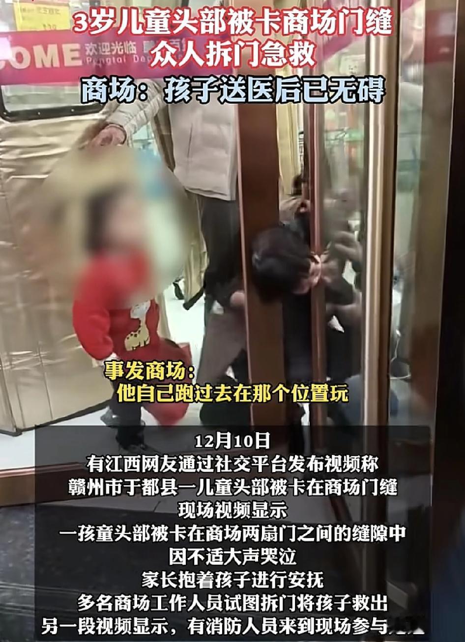 江西赣州一3岁儿童玩耍时头部不慎被卡住,在商场玻璃门的门缝处。小孩子想钻过去,但是钻进去就出不来了。在场的人都纷纷急救,最后是把门拆掉了,孩子哭太久哭晕去了,不过没有安全问题。家长在户外一定要看管好自己的孩子这种情况虽然孩子没事,也要赔偿商家一定的损失。