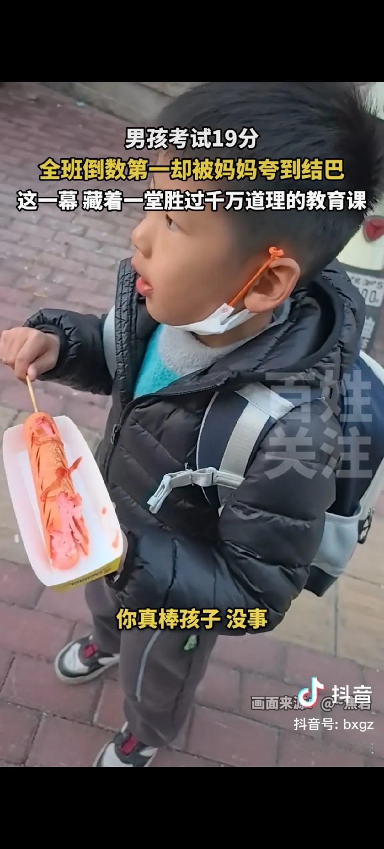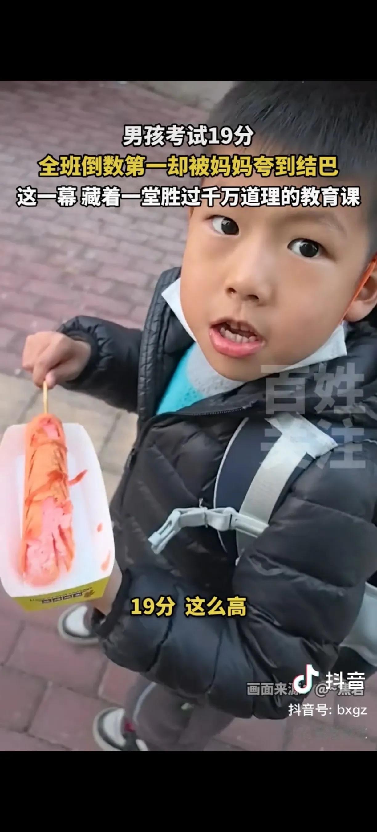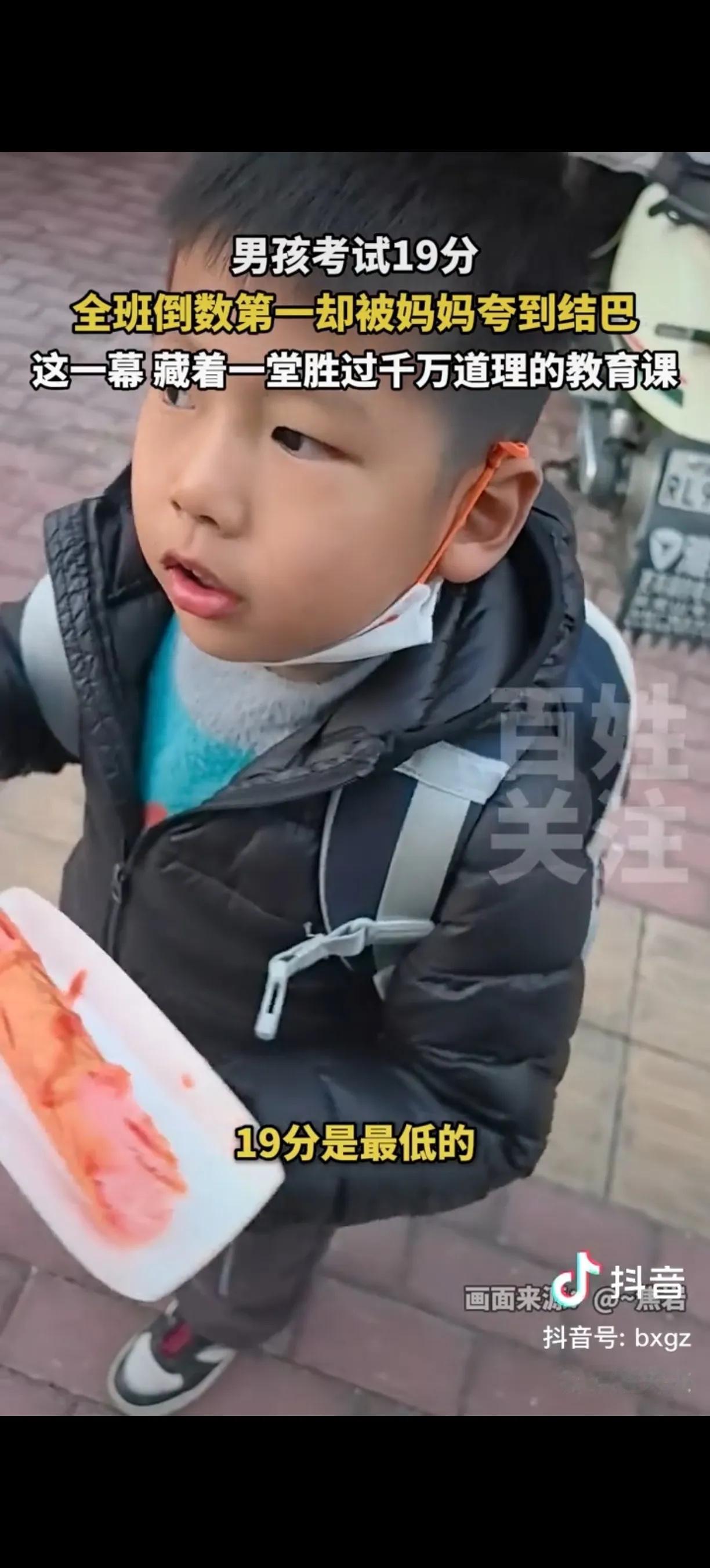 “万万没想到!”湖北,一男孩数学考了19分,全班倒数第一,本以为会被妈妈收拾,没想到妈妈听完不仅没骂他,甚至还夸奖他真棒,把他都夸懵了。 妈妈接他放学时,他攥着试卷跟在身后,小声嘟囔“19分是全班最低的”,手里的烤肠都忘了咬,腮帮子憋得鼓鼓的,等着妈妈的批评。 可妈妈摸了摸他的头,笑着说“19分这么高啊,我儿子真棒”,声音里满是笑意,还把他手里的烤肠往嘴边递了递,让他赶紧吃。 男孩眼睛瞪得溜圆,嘴里的烤肠差点掉出来,愣了半天反问“真的吗”,见妈妈点头,他才咬了一大口烤肠,嘴角偷偷往上扬。 走在回家的路上,他把试卷捏得不再发皱,还跟妈妈说“下次我要考更高”,小胸脯挺得高高的,连脚步都轻快了不少。 路人听见母子俩的对话,忍不住回头笑,这19分的试卷,没变成指责的理由,反倒成了妈妈鼓励孩子的契机,比千言万语的大道理都管用。
