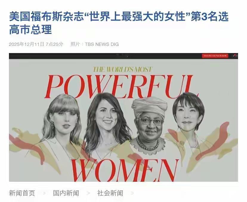 高市早苗一夜成名! 美国经济杂志《福布斯》公布了“世界上最强大的女性”100人名单,即“全球女强人排行榜”,高市早苗位列第三。 该杂志赞誉包括高市早苗在内的上榜女性,称她们是“动荡时代不屈不挠精神的象征”。 榜单首位是欧盟委员会主席冯德莱恩,第二名是欧洲央行行长拉加德。 不过,这也不足为奇。一个在欧盟兴风作浪,搅乱整个欧洲;一个在日本倒行逆施,祸乱整个亚洲。一北一南,这两个“妖精”迟早会自食恶果!