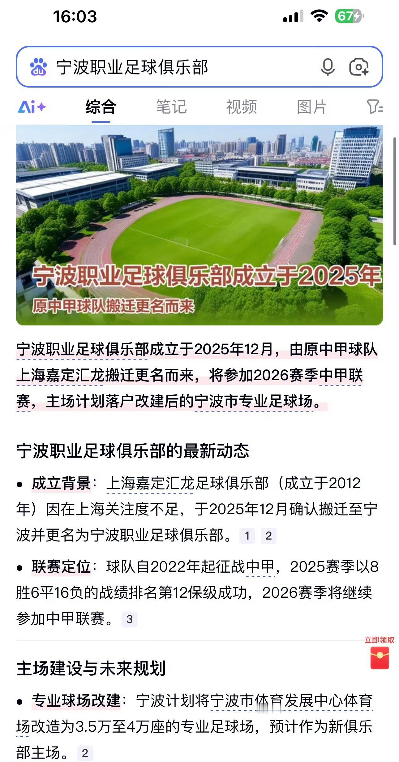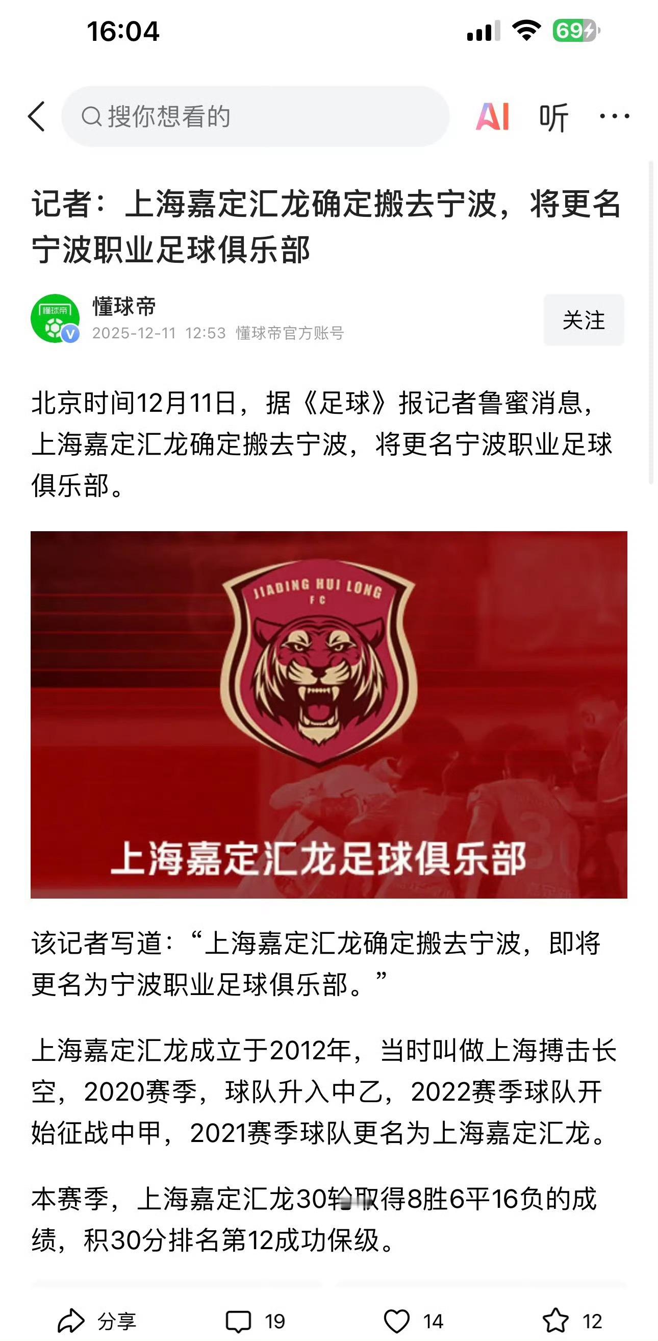 宁波职业足球俱乐部真的来了 ?百度上搜索也有了据“懂球帝”:北京时间12月11日,据《足球》报记者鲁蜜消息,上海嘉定汇龙确定搬去宁波,将更名宁波职业足球俱乐部。该记者写道:“上海嘉定汇龙确定搬去宁波,即将更名为宁波职业足球俱乐部。”上海嘉定汇龙成立于2012年,当时叫做上海搏击长空,2020赛季,球队升入中乙,2022赛季球队开始征战中甲,2021赛季球队更名为上海嘉定汇龙。本赛季,上海嘉定汇龙30轮取得8胜6平16负的成绩,积30分排名第12成功保级。