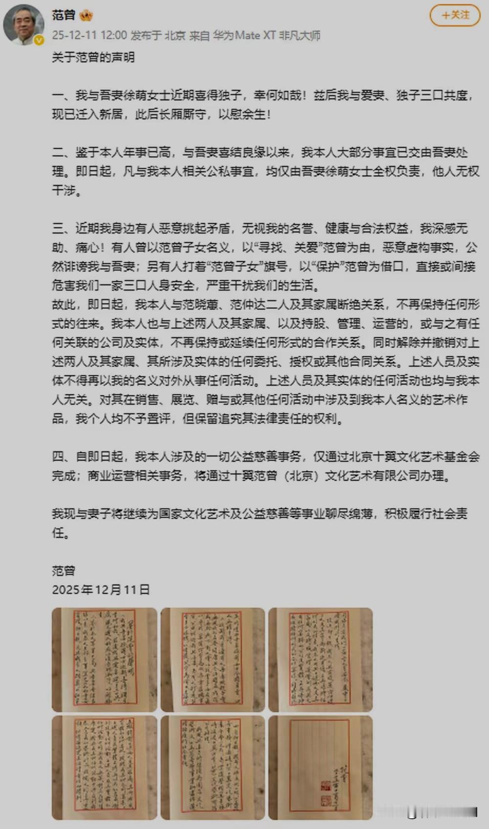 12月11日,87岁的著名书画家@范曾 发文回应近期争议,在宣布老来得子的同时,声明与女儿、继子及其家属断绝关系,不再保持任何形式的往来。 87岁还能生孩子?范增再添一子的消息让网友们感到吃惊!甚至认为87岁的男士还有生育能力,根本就没有这个可能性。于是,有网友在评论区含沙射影的讲了如下一段故事:老猎人上山打猎,发现一头小鹿,举枪射击,枪无响声,遭遇哑弹!但小鹿瞬间倒下,原来小鹿是被藏在草丛里的另一位猎人一枪命中。 其实,认为87岁的男人没有生育能力的思想太保守了。别说现在的科技如此发达,人工受孕非常容易。即便不用高科技,部分高龄男人仍然有生育能力。例如:国民党著名将领杨森,90岁还能让第12任夫人怀孕生儿子。 所以,87岁的著名书画家范增老来得子,大家没有必要感到吃惊!这只能证明:范增老爷子宝刀不老,他还行!