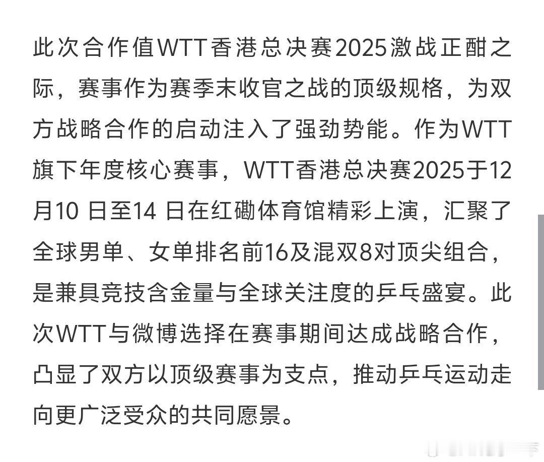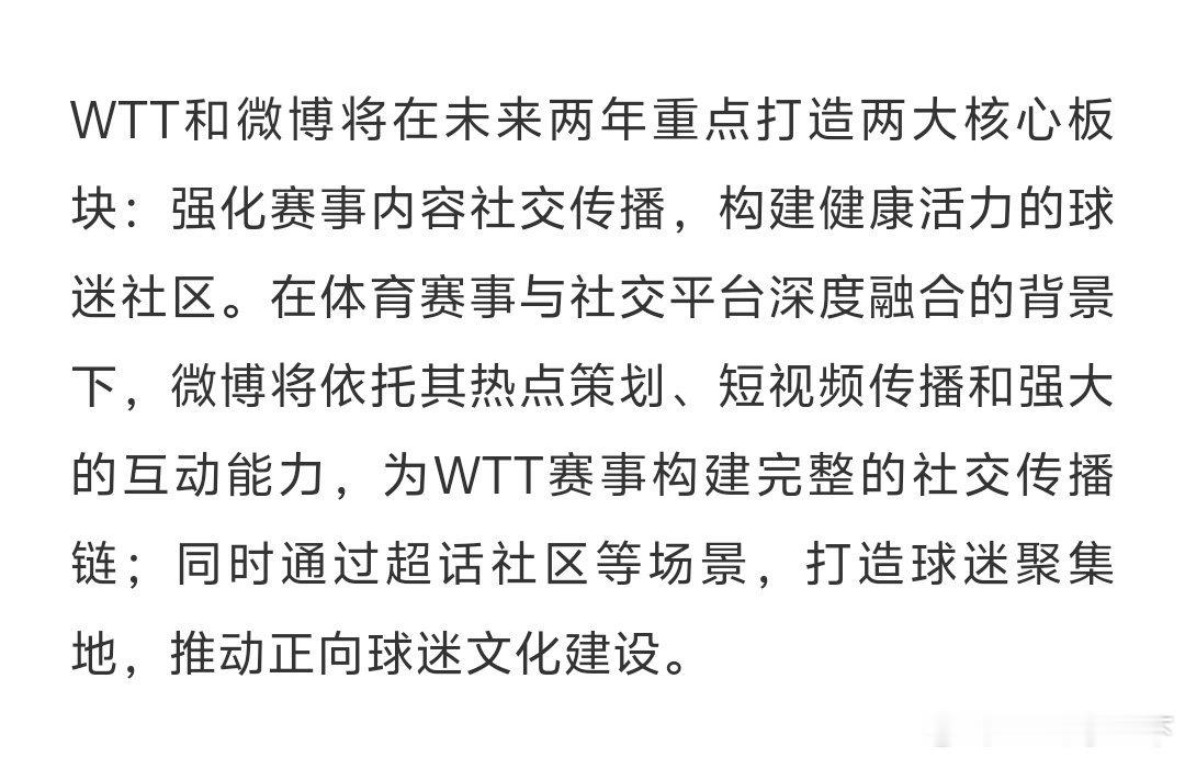 这波“乒乓球+社交”结合太懂乒乓球迷的心了!作为常年蹲赛事的博主期待住了,微博将靠短视频传播和互动优势,打造乒乓球超话社区让球迷一眼锁定,还会变身球迷聚集地,以后聊赛事、追球星动态更方便了。期待解锁实时战报,乒乓热爱不打烊,让我们一起期待后续精彩。WTT与微博达成战略合作