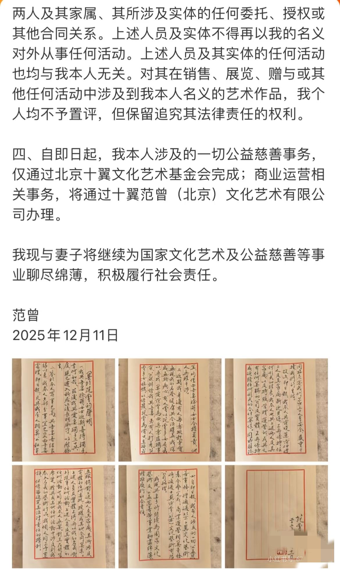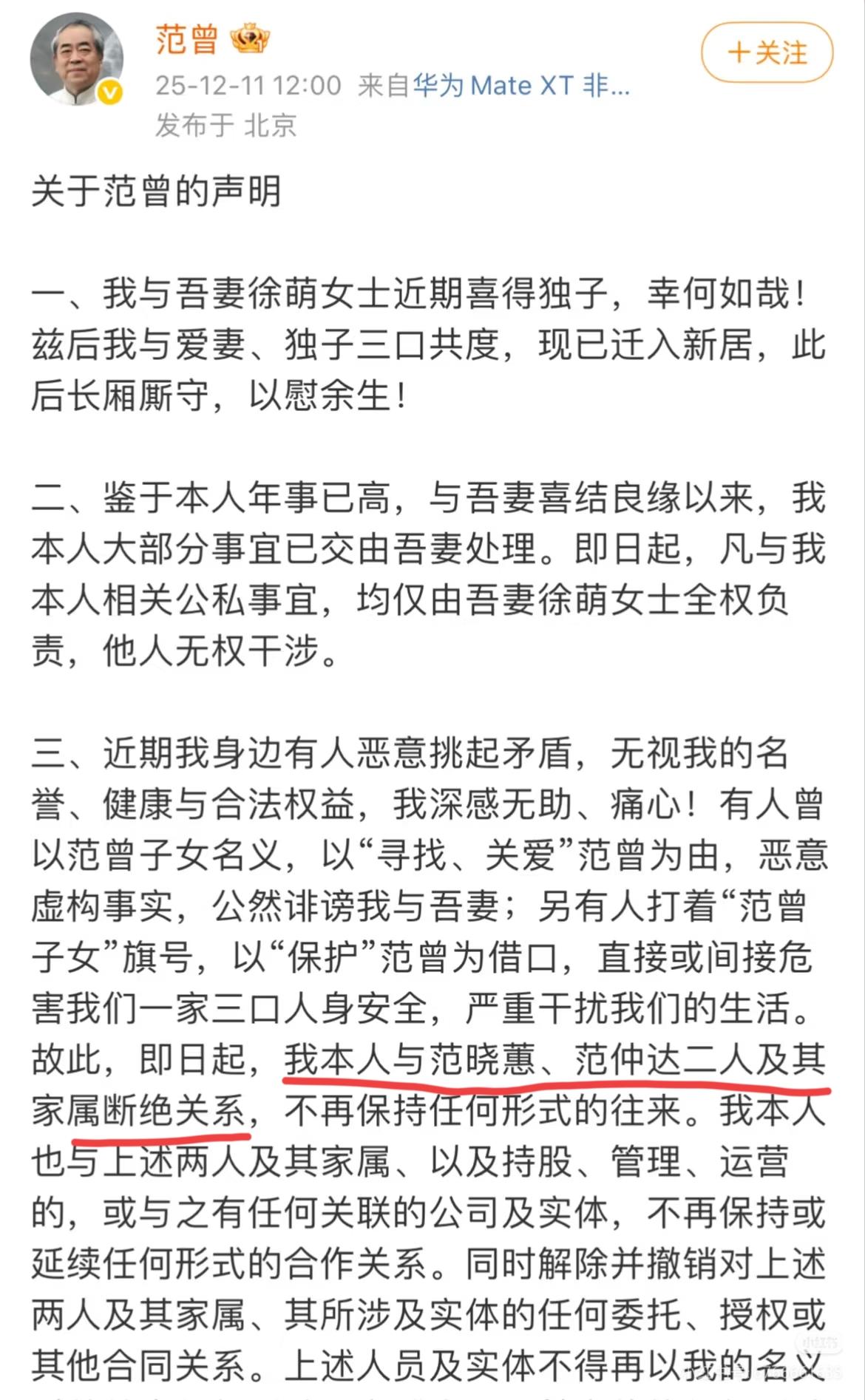 87岁范曾老爷子发声了,看来和前子女的矛盾是不可调和了,都到了断绝关系的地步了。 没办法,新媳妇确实年轻漂亮,按一般情况,这里面无非是金钱的矛盾。 类似的事情,在我们农村听过不少不少,比如:一个男的为了新欢,老婆孩子都不要了,甚至有的还帮新欢养前夫的孩子。不过这种男的往往老了以后会很惨。 范曾老爷子有钱,和普通人还是不同的,想必以后还是会很幸福的。