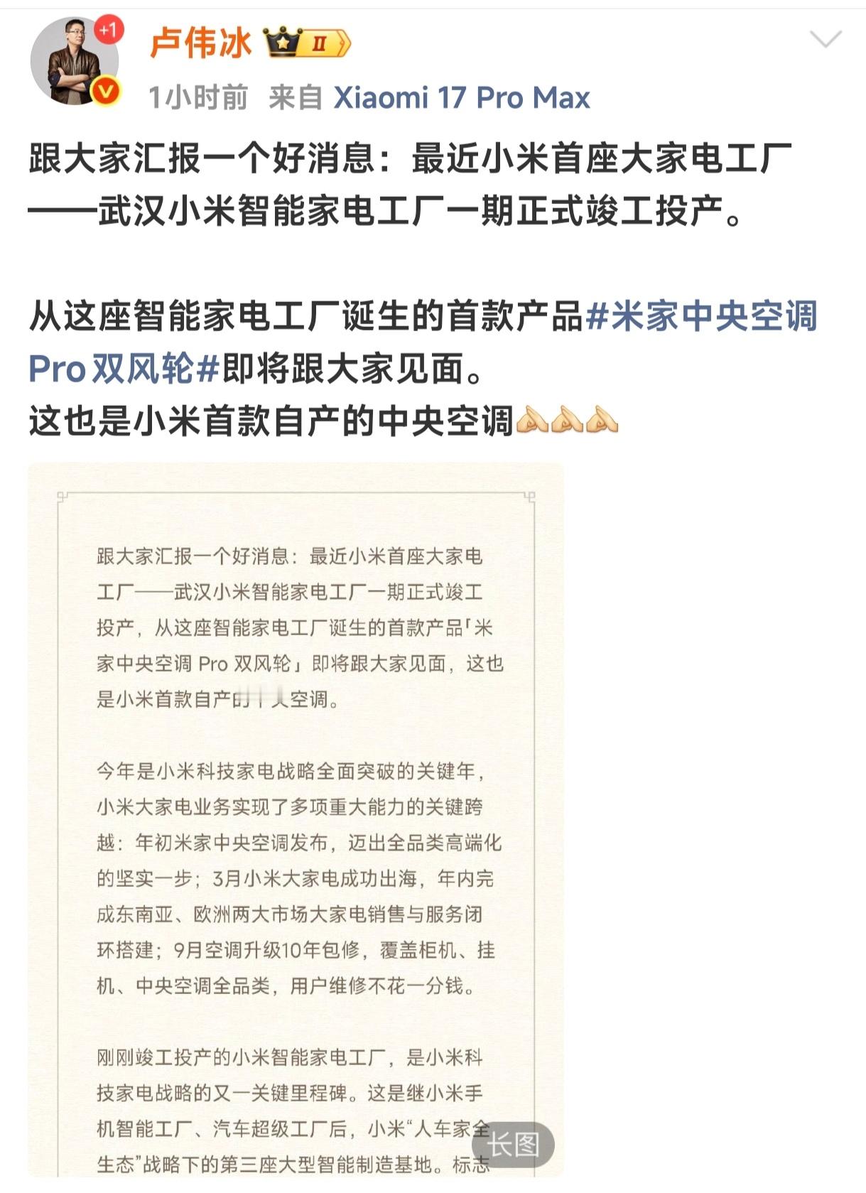 小米要发自产中央空调了?!卢伟冰宣布小米将发布自产中央空调真的被小米的速度惊到,从手机到汽车,现在连中央空调都要自研自产,手握三座智能工厂,我看以后谁还敢黑“组装厂”、“没技术”。6.5秒下线一台空调,±0.05mm的制造公差,关键零部件100%AI质检,这制造效率和品控直接卷穿行业!更狠的是家用+中央空调统统10年包修,自建工厂就是敢这么豪横。现在的小米,是全球唯一一个手握手机、智能家电、汽车产研一体能力的品牌,质疑它5年成家电头部的声音,早就追不上它的脚步了。从最难的中央空调切入,未来小米大家电还有什么不可能?