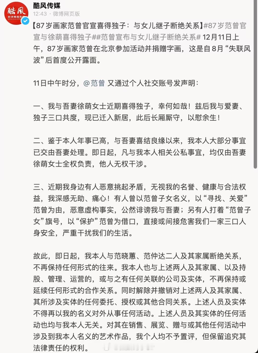 87岁画家范曾喜获独子八十七岁还能生???老当益壮啊