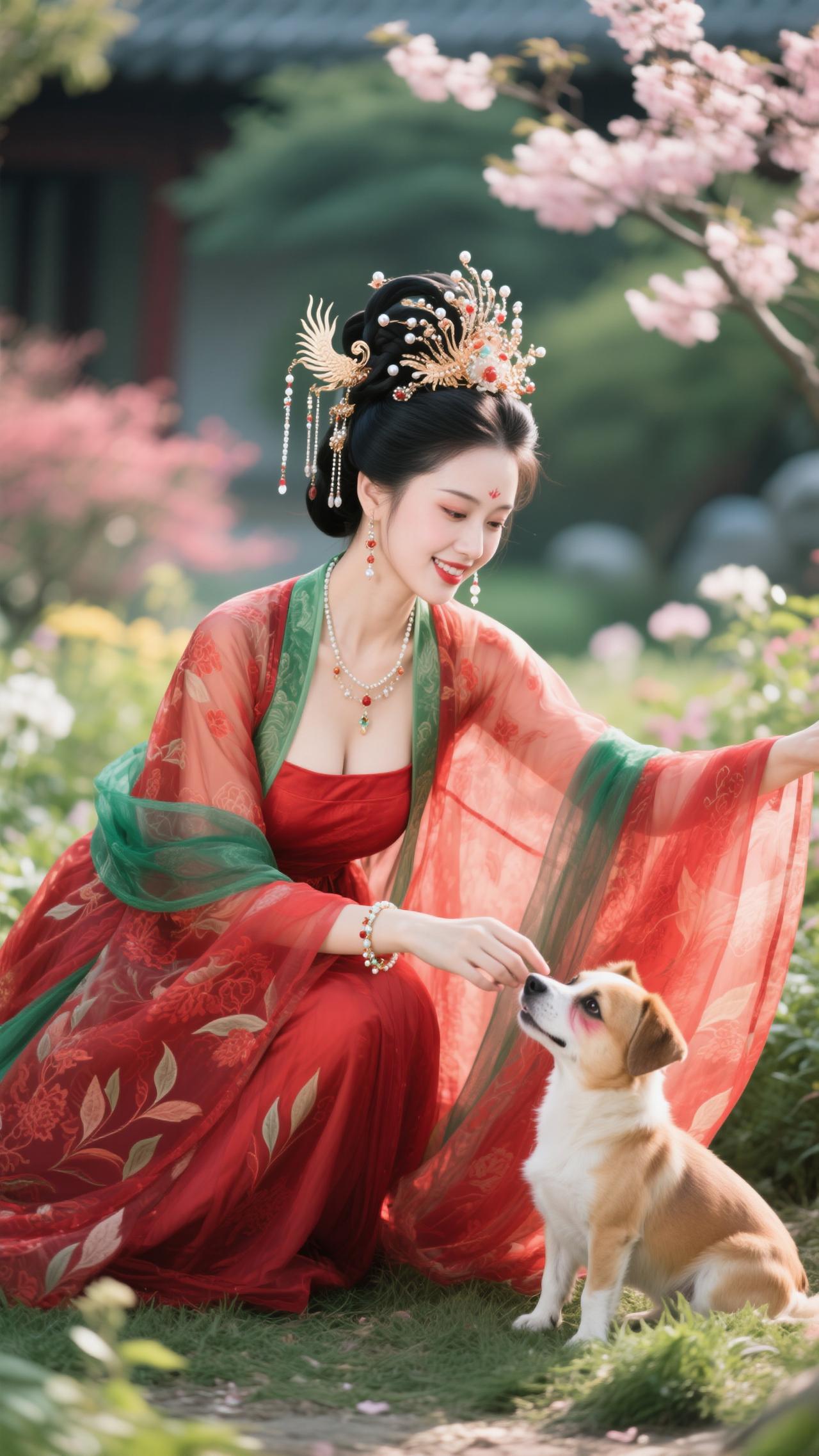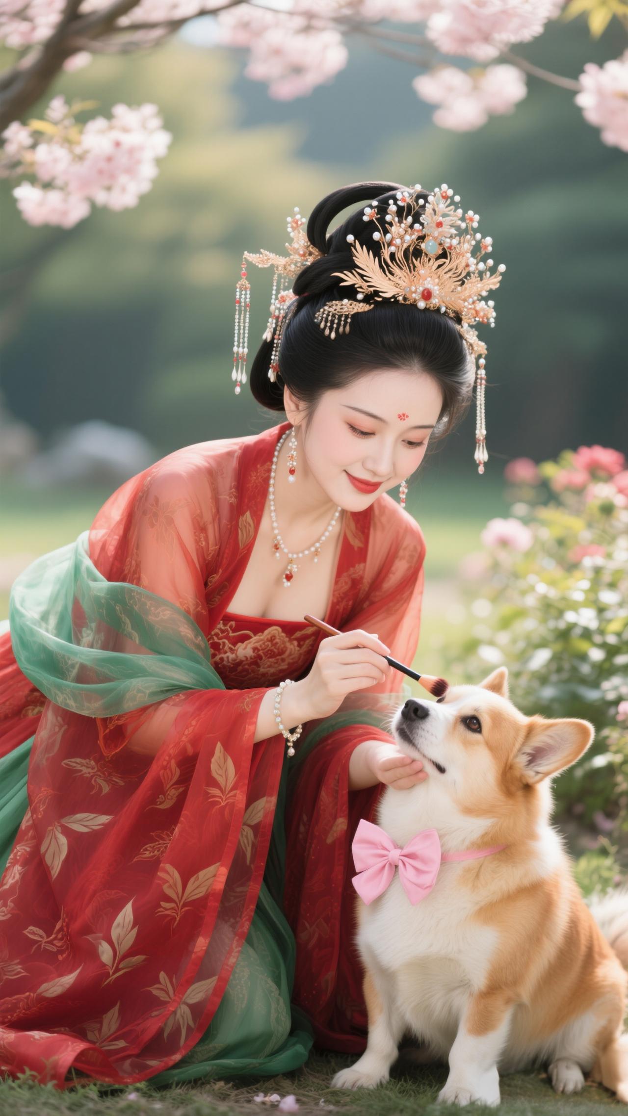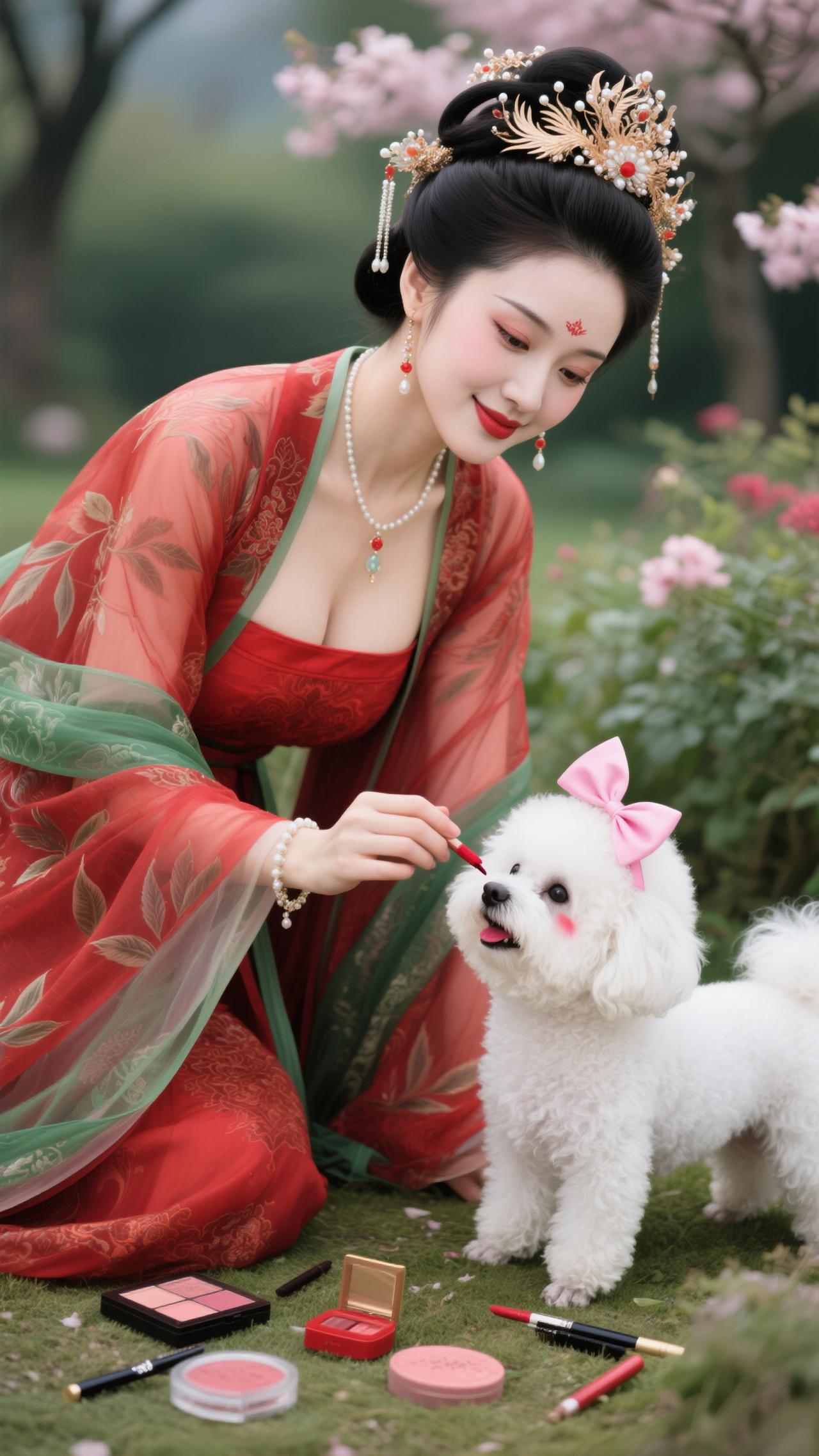 《南歌子·红妆戏犬》 樱雪飘金钿,红妆映绿纱。 戏将花影逗萌娃(犬),软尾轻摇偷舔、指尖霞。 笑靥凝春露,芳襟惹絮华。 满园晴色共欢哗,懒把琵琶轻抱、醉桃花。